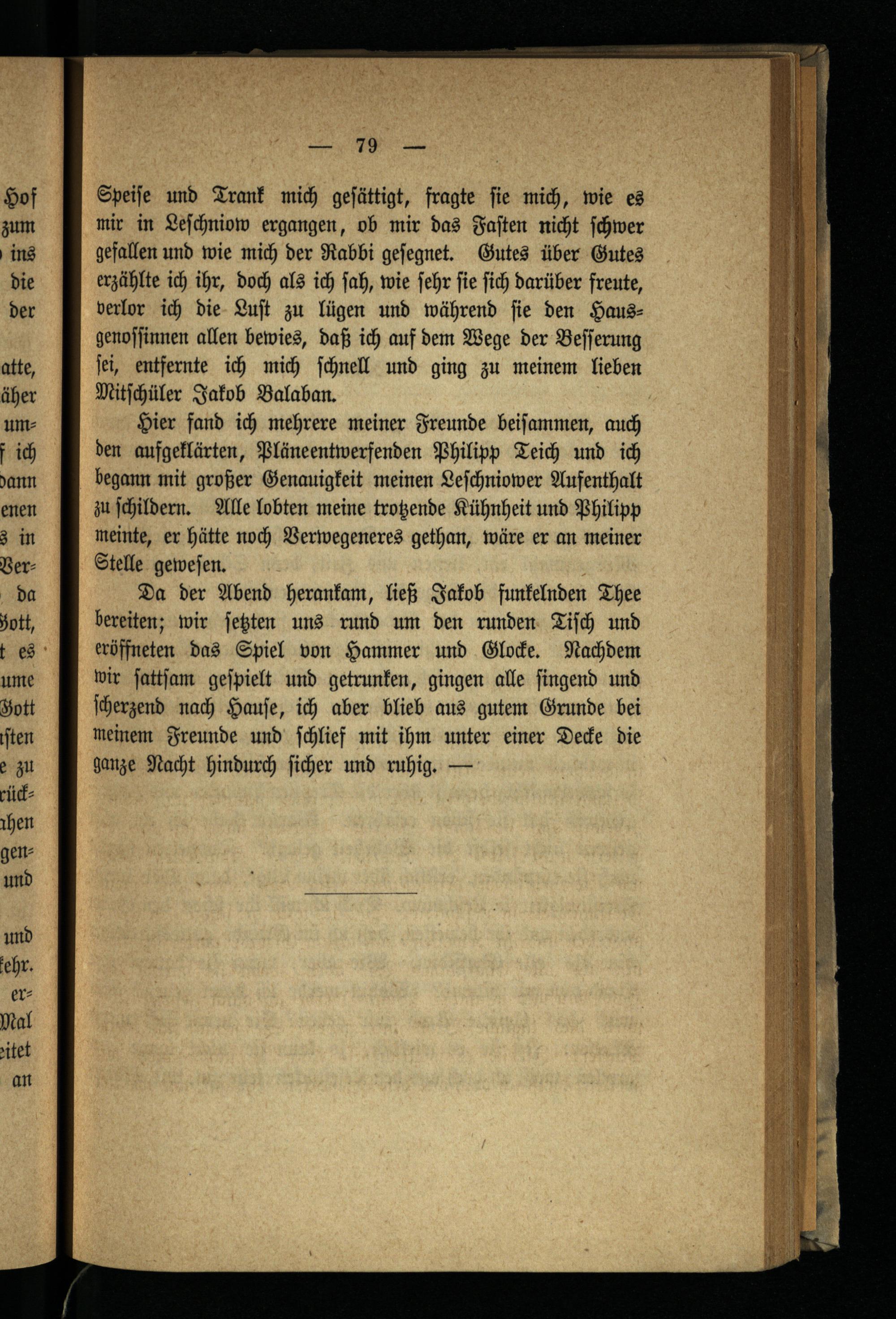 Speiſe und Trank mich geſättigt, fragte fie mich, wie es mir in Leſchniow ergangen, ob mir das Faſten nicht ſchwer gefallen und wie mich der Rabbi geſegnet. Gutes über Gutes erzählte ich ihr, doch als ich ſah, wie ſehr ſie ſich darüber freute, verlor ich die Luſt zu lügen und während ſie den Hausgenoſſinnen allen bewies, daß ich auf dem Wege der Beſſerung ſei, entfernte ich mich ſchnell und ging zu meinem lieben Mitſchüler Jakob Balaban.