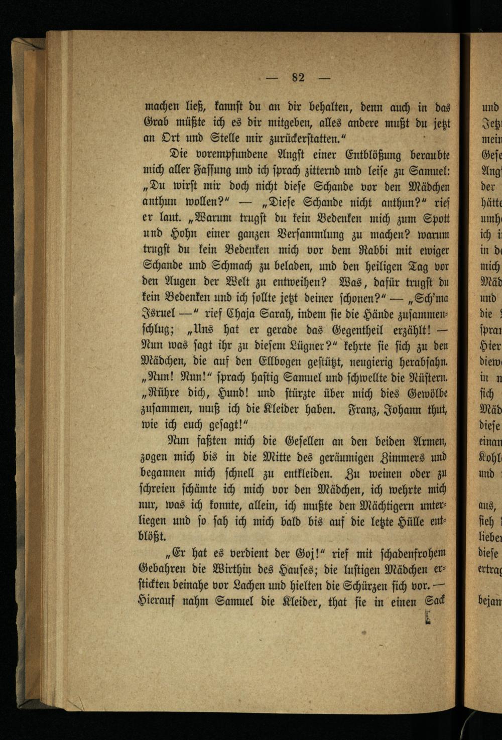Die vorempfundene Angſt einer Entblößung beraubte mich aller Faſſung und ich ſprach zitternd und leiſe zu Samuel: „Du wirſt mir doch nicht dieſe Schande vor den Mädchen anthun wollen?“—„Dieſe Schande nicht anthun?“ rief er laut.„Warum trugſt du kein Bedenken mich zum Spott und Hohn einer ganzen Verſammlung zu machen? warum trugſt du kein Bedenken mich vor dem Rabbi mit ewiger Schande und Schmach zu beladen, und den heiligen Tag vor den Augen der Welt zu entweihen? Was, dafür trugſt du kein Bedenken und ich ſollte jetzt deiner ſchonen?“—„Schema Isruel— rief Chaja Sarah, indem fie die Hände zuſammenſchlug;„Uns hat er gerade das Gegentheil erzählt!— Nun was ſagt ihr zu dieſem Lügner?“ kehrte ſie ſich zu den Mädchen, die auf den Ellbogen geſtützt, neugierig herabſahn. „Nun! Nun!“ ſprach haſtig Samuel und ſchwellte die Nüſtern. „Rühre dich, Hund! und ſtürzte über mich dies Gewölbe zuſammen, muß ich die Kleider haben. Franz, Johann thut, wie ich euch geſagt!“