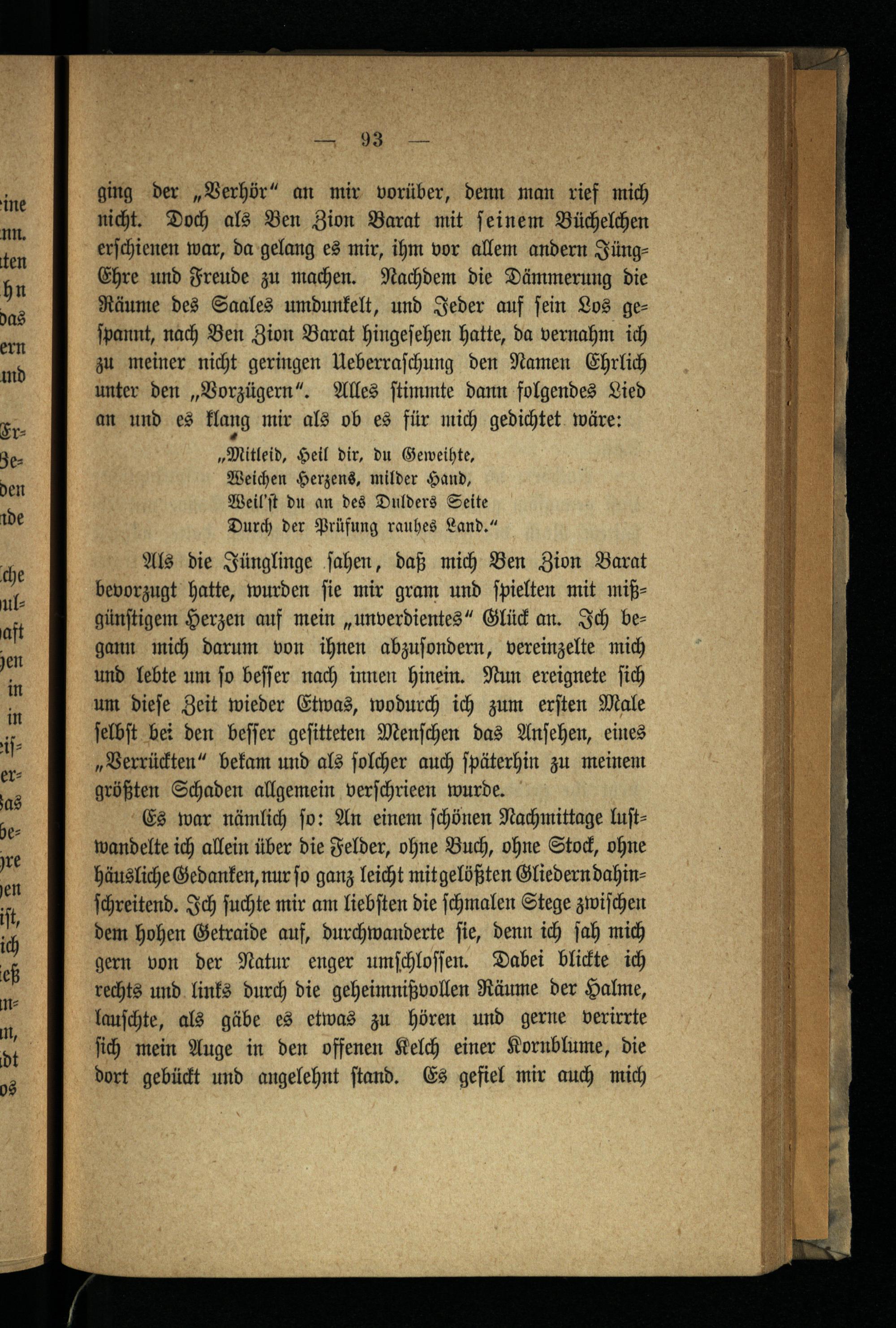 Als die Jünglinge ſahen, daß mich Ben Zion Barat bevorzugt hatte, wurden ſie mir gram und ſpielten mit mißgünſtigem Herzen auf mein„unverdientes“ Glück an. Ich begann mich darum von ihnen abzuſondern, vereinzelte mich