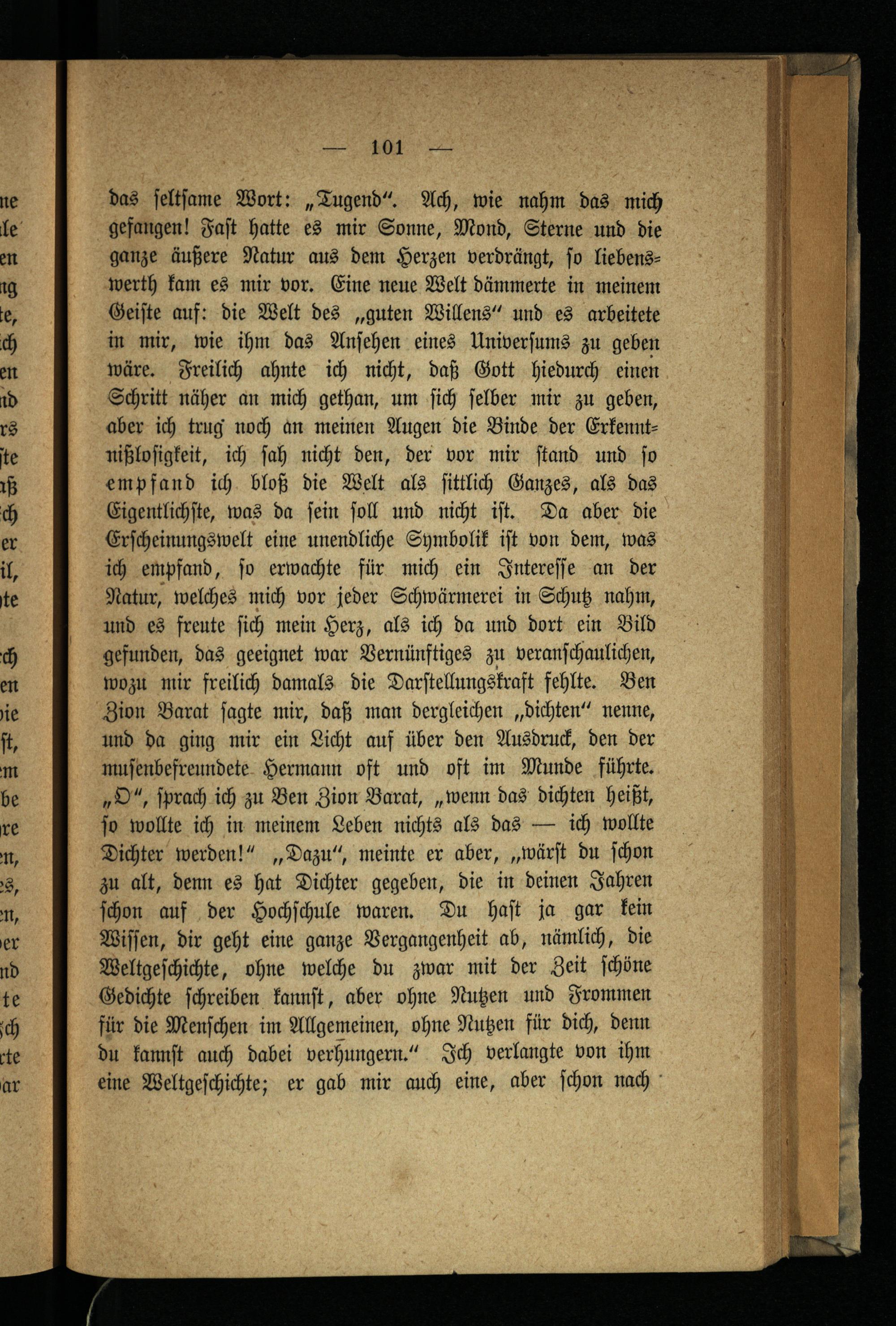 das ſeltſame Wort:„Tugend“. Ach, wie nahm das mich gefangen! Faſt hatte es mir Sonne, Mond, Sterne und die ganze äußere Natur aus dem Herzen verdrängt, ſo liebens— werth kam es mir vor. Eine neue Welt dämmerte in meinem Geiſte auf: die Welt des„guten Willens“ und es arbeitete in mir, wie ihm das Anſehen eines Univerſums zu geben wäre. Freilich ahnte ich nicht, daß Gott hiedurch einen Schritt näher an mich gethan, um ſich ſelber mir zu geben, aber ich trug noch an meinen Augen die Binde der Erkenntnißloſigkeit, ich ſah nicht den, der vor mir ſtand und ſo empfand ich bloß die Welt als ſittlich Ganzes, als das Eigentlichſte, was da ſein ſoll und nicht iſt. Da aber die Erſcheinungswelt eine unendliche Symbolik iſt von dem, was ich empfand, ſo erwachte für mich ein Intereſſe an der Natur, welches mich vor jeder Schwärmerei in Schutz nahm, und es freute ſich mein Herz, als ich da und dort ein Bild gefunden, das geeignet war Vernünftiges zu veranſchaulichen, wozu mir freilich damals die Darſtellungskraft fehlte. Ben Zion Barat ſagte mir, daß man dergleichen„dichten“ nenne, und da ging mir ein Licht auf über den Ausdruck, den der muſenbefreundete Hermann oft und oft im Munde führte. „O“, ſprach ich zu Ben Zion Barat,„wenn das dichten heißt, ſo wollte ich in meinem Leben nichts als das— ich wollte Dichter werden!“„Dazu“, meinte er aber,„wärſt du ſchon zu alt, denn es hat Dichter gegeben, die in deinen Jahren ſchon auf der Hochſchule waren. Du haſt ja gar kein Wiſſen, dir geht eine ganze Vergangenheit ab, nämlich, die Weltgeſchichte, ohne welche du zwar mit der Zeit ſchöne Gedichte ſchreiben kannſt, aber ohne Nutzen und Frommen für die Menſchen im Allgemeinen, ohne Nutzen für dich, denn du kannſt auch dabei verhungern.“ Ich verlangte von ihm