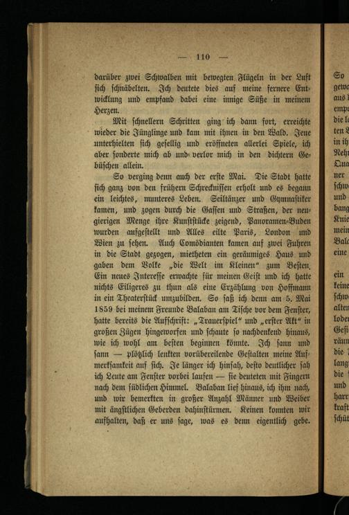 So verging denn auch der erſte Mai. Die Stadt hatte ſich ganz von den frühern Schreckniſſen erholt und es begann ein leichtes, munteres Leben. Seiltänzer und Gymnaſtiker kamen, und zogen durch die Gaſſen und Straßen, der neugierigen Menge ihre Kunſtſtücke zeigend, Panoramen⸗-Buden wurden aufgeſtellt und Alles eilte Paris , London und Wien zu ſehen. Auch Comödianten kamen auf zwei Fuhren in die Stadt gezogen, mietheten ein geräumiges Haus und gaben dem Volke„die Welt im Kleinen“ zum Beſten. Ein neues Intereſſe erwachte für meinen Geiſt und ich hatte nichts Eiligeres zu thun als eine Erzählung von Hoffmann in ein Theaterſtück umzubilden. So ſaß ich denn am 5. Mai 1859 bei meinem Freunde Balaban am Tiſche vor dem Fenſter, hatte bereits die Aufſchrift:„Trauerſpiel“ und„erſter Akt“ in großen Zügen hingeworfen und ſchaute ſo nachdenkend hinaus, wie ich wohl am beſten beginnen könnte. Ich ſann und ſann— plötzlich lenkten vorübereilende Geſtalten meine Aufmerkſamkeit auf ſich. Je länger ich hinſah, deſto deutlicher ſah ich Leute am Fenſter vorbei laufen— ſie deuteten mit Fingern nach dem ſüdlichen Himmel. Balaban lief hinaus, ich ihm nach, und wir bemerkten in großer Anzahl Männer und Weiber mit ängſtlichen Geberden dahinſtürmen. Keinen konnten wir aufhalten, daß er uns ſage, was es denn eigentlich gebe.
