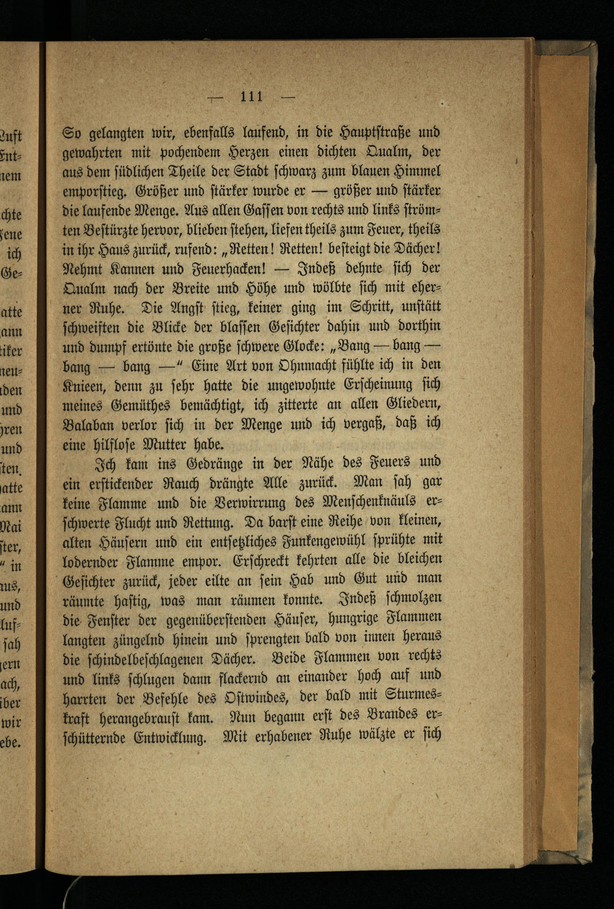 So gelangten wir, ebenfalls laufend, in die Hauptſtraße und gewahrten mit pochendem Herzen einen dichten Qualm, der aus dem ſüdlichen Theile der Stadt ſchwarz zum blauen Himmel emporſtieg. Größer und ſtärker wurde er— größer und ſtärker die laufende Menge. Aus allen Gaſſen von rechts und links ſtrömten Beſtürzte hervor, blieben ſtehen, liefen theils zum Feuer, theils in ihr Haus zurück, rufend:„Retten! Retten! beſteigt die Dächer! Nehmt Kannen und Feuerhacken!— Indeß dehnte ſich der Qualm nach der Breite und Höhe und wölbte ſich mit eherner Ruhe. Die Angſt ſtieg, keiner ging im Schritt, unſtätt ſchweiften die Blicke der blaſſen Geſichter dahin und dorthin und dumpf ertönte die große ſchwere Glocke: ‚ Bang— bang— bang— bang—“ Eine Art von Ohnmacht fühlte ich in den Knieen, denn zu ſehr hatte die ungewohnte Erſcheinung ſich meines Gemüthes bemächtigt, ich zitterte an allen Gliedern, Balaban verlor ſich in der Menge und ich vergaß, daß ich eine hilfloſe Mutter habe.