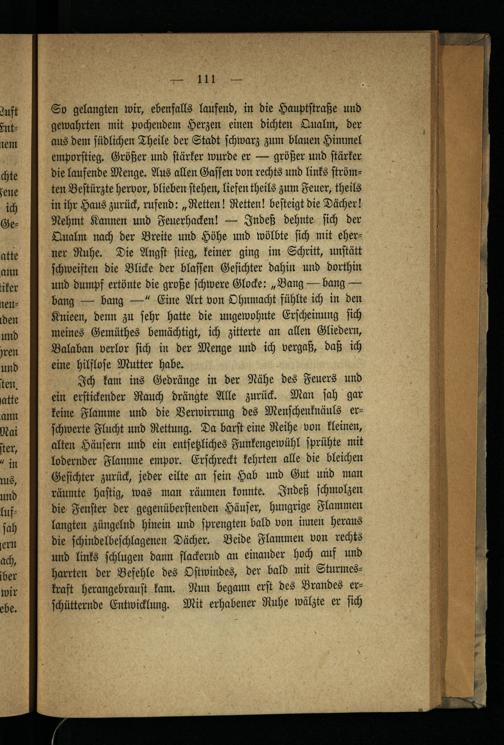 Ich kam ins Gedränge in der Nähe des Feuers und ein erſtickender Rauch drängte Alle zurück. Man ſah gar keine Flamme und die Verwirrung des Menſchenknäuls erſchwerte Flucht und Rettung. Da barſt eine Reihe von kleinen, alten Häuſern und ein entſetzliches Funkengewühl ſprühte mit lodernder Flamme empor. Erſchreckt kehrten alle die bleichen Geſichter zurück, jeder eilte an ſein Hab und Gut und man räumte haſtig, was man räumen konnte. Indeß ſchmolzen die Fenſter der gegenüberſtenden Häuſer, hungrige Flammen langten züngelnd hinein und ſprengten bald von innen heraus die ſchindelbeſchlagenen Dächer. Beide Flammen von rechts und links ſchlugen dann flackernd an einander hoch auf und harrten der Befehle des Oſtwindes, der bald mit Sturmeskraft herangebrauſt kam. Nun begann erſt des Brandes erſchütternde Entwicklung. Mit erhabener Ruhe wälzte er ſich