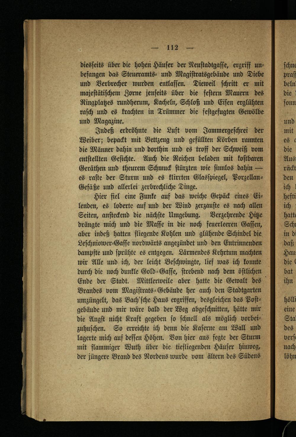 Hier fiel eine Funke auf das weiche Gepäck eines Eilenden, es loderte auf und der Wind zerzauſte es nach allen Seiten, anſteckend die nächſte Umgebung. Verzehrende Hitze drängte mich und die Maſſe in die noch feuerleeren Gaſſen, aber indeß hatten fliegende Kohlen und glühende Schindel die Leſchniower⸗Gaſſe nordwärts angezündet und den Entrinnenden dampfte und ſprühte es entgegen. Lärmendes Kehrtum machten wir Alle und ich, der leicht Beſchwingte, lief was ich konnte durch die noch dunkle Gold⸗Gaſſe, ſtrebend nach dem öſtlichen Ende der Stadt. Mittlerweile aber hatte die Gewalt des Brandes vom Magiſtrats-Gebäude her auch den Stadtgarten umzüngelt, das Bach'ſche Haus ergriffen, desgleichen das Poſtgebäude und mir wäre bald der Weg abgeſchnitten, hätte mir die Angſt nicht Kraft gegeben fo ſchnell als möglich vorbei zuhuſchen. So erreichte ich denn die Kaſerne am Wall und lagerte mich auf deſſen Höhen. Von hier aus fegte der Sturm mit flammiger Wuth über die tiefliegenden Häuſer hinweg, der jüngere Brand des Nordens wurde vom ältern des Südens