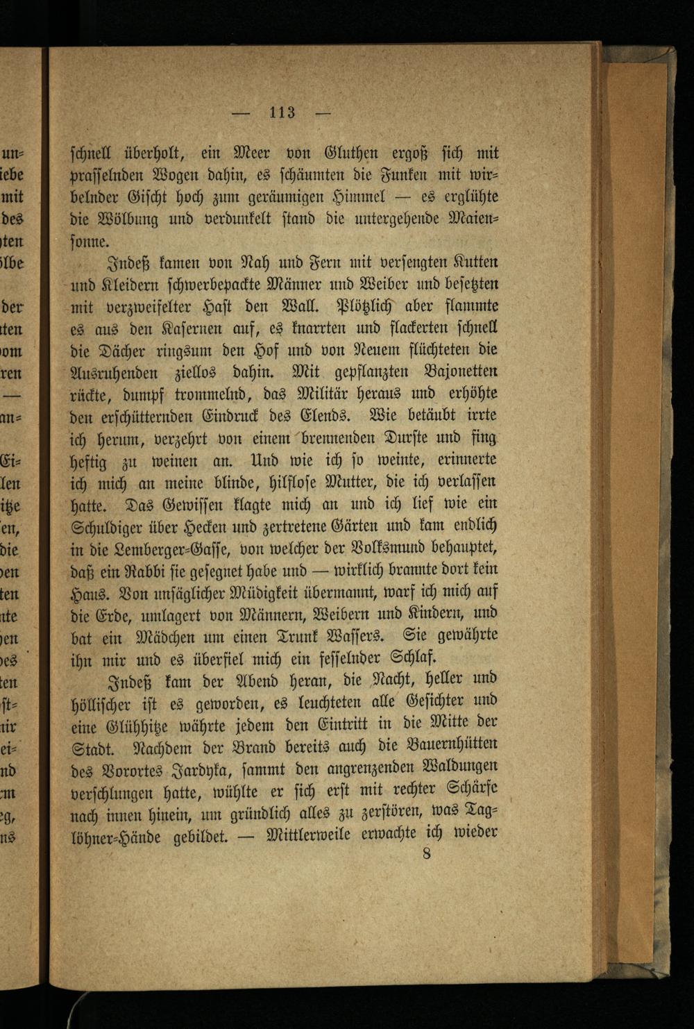 Indeß kamen von Nah und Fern mit verſengten Kutten und Kleidern ſchwerbepackte Männer und Weiber und beſetzten mit verzweifelter Haſt den Wall. Plötzlich aber flammte es aus den Kaſernen auf, es knarrten und flackerten ſchnell die Dächer ringsum den Hof und von Neuem flüchteten die Ausruhenden ziellos dahin. Mit gepflanzten Bajonetten rückte, dumpf trommelnd, das Militär heraus und erhöhte den erſchütternden Eindruck des Elends. Wie betäubt irrte ich herum, verzehrt von einem brennenden Durſte und fing heftig zu weinen an. Und wie ich ſo weinte, erinnerte ich mich an meine blinde, hilfloſe Mutter, die ich verlaſſen hatte. Das Gewiſſen klagte mich an und ich lief wie ein Schuldiger über Hecken und zertretene Gärten und kam endlich in die Lemberger⸗Gaſſe, von welcher der Volksmund behauptet, daß ein Rabbi ſie geſegnet habe und— wirklich brannte dort kein Haus. Von unſäglicher Müdigkeit übermannt, warf ich mich auf die Erde, umlagert von Männern, Weibern und Kindern, und bat ein Mädchen um einen Trunk Waſſers. Sie gewährte ihn mir und es überfiel mich ein feſſelnder Schlaf.