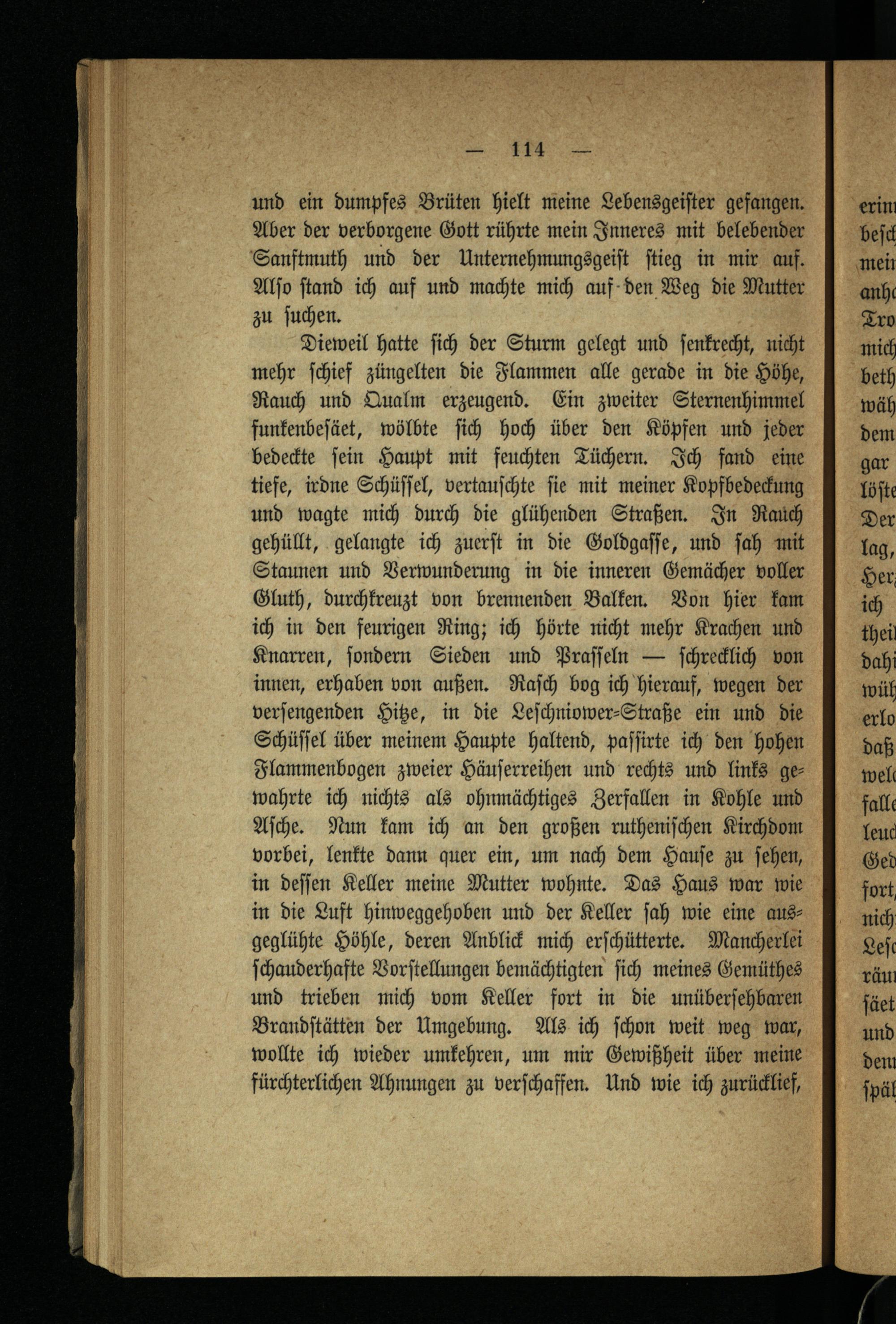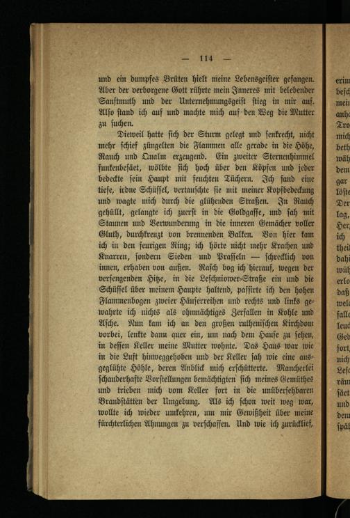 Dieweil hatte ſich der Sturm gelegt und ſenkrecht, nicht mehr ſchief züngelten die Flammen alle gerade in die Höhe, Rauch und Qualm erzeugend. Ein zweiter Sternenhimmel funkenbeſäet, wölbte ſich hoch über den Köpfen und jeder bedeckte ſein Haupt mit feuchten Tüchern. Ich fand eine tiefe, irdne Schüſſel, vertauſchte ſie mit meiner Kopfbedeckung und wagte mich durch die glühenden Straßen. In Rauch gehüllt, gelangte ich zuerſt in die Goldgaſſe, und ſah mit Staunen und Verwunderung in die inneren Gemächer voller Gluth, durchkreuzt von brennenden Balken. Von hier kam ich in den feurigen Ring; ich hörte nicht mehr Krachen und Knarren, ſondern Sieden und Praſſeln— ſchrecklich von innen, erhaben von außen. Raſch bog ich hierauf, wegen der verſengenden Hitze, in die Leſchniower⸗Straße ein und die Schüſſel über meinem Haupte haltend, paſſirte ich den hohen Flammenbogen zweier Häuſerreihen und rechts und links gewahrte ich nichts als ohnmächtiges Zerfallen in Kohle und Aſche. Nun kam ich an den großen rutheniſchen Kirchdom vorbei, lenkte dann quer ein, um nach dem Hauſe zu ſehen, in deſſen Keller meine Mutter wohnte. Das Haus war wie in die Luft hinweggehoben und der Keller Jah wie eine ausgeglühte Höhle, deren Anblick mich erſchütterte. Mancherlei ſchauderhafte Vorſtellungen bemächtigten ſich meines Gemüthes und trieben mich vom Keller fort in die unüberſehbaren Brandſtätten der Umgebung. Als ich ſchon weit weg war, wollte ich wieder umkehren, um mir Gewißheit über meine fürchterlichen Ahnungen zu verſchaffen. Und wie ich zurücklief,