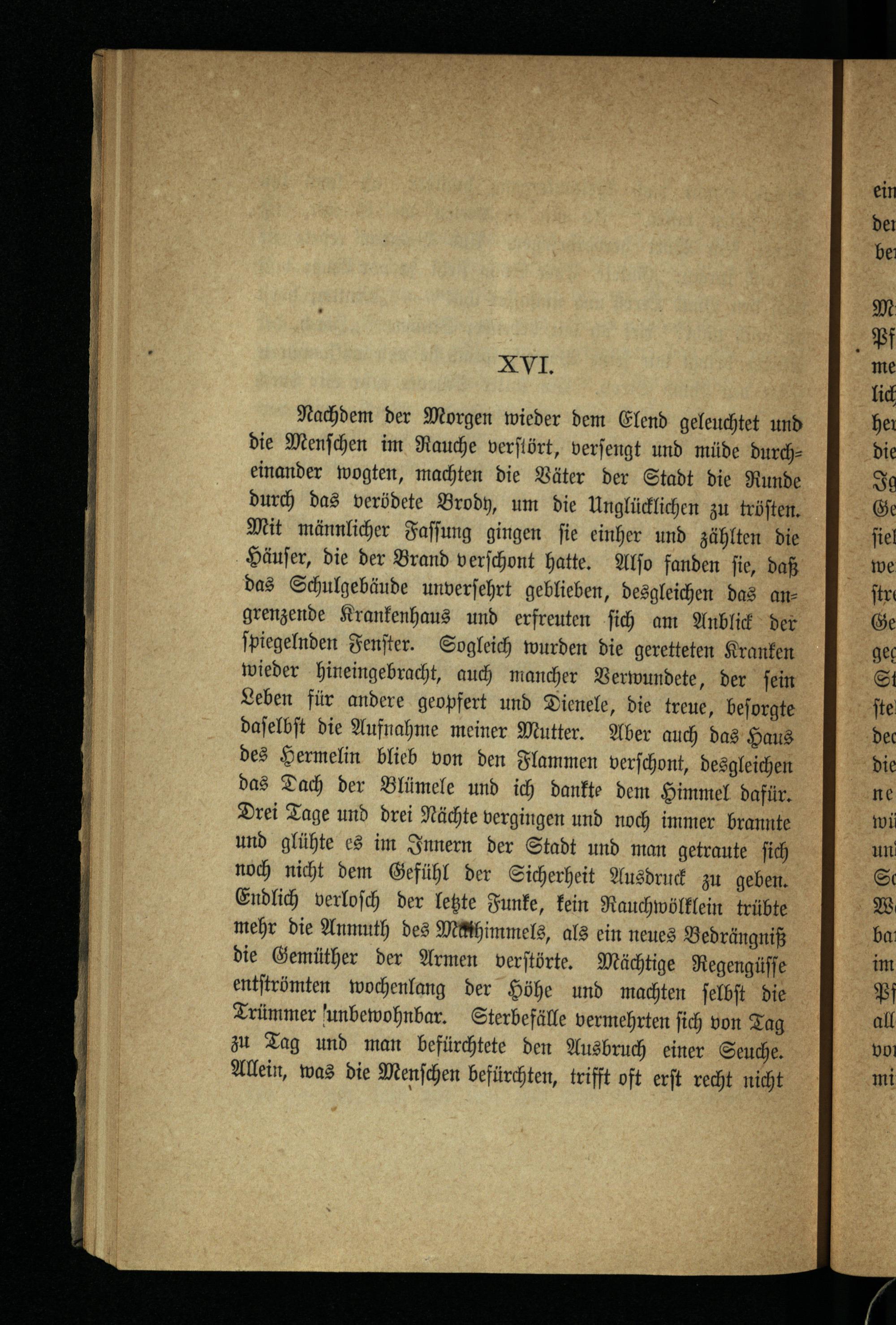 Nachdem der Morgen wieder dem Elend geleuchtet und die Menſchen im Rauche verſlört, verſengt und müde durcheinander wogten, machten die Väter der Stadt die Runde durch das verödete Brody, um die Unglücklichen zu tröſten. Mit männlicher Faſſung gingen ſie einher und zählten die Häuſer, die der Brand verſchont hatte. Alſo fanden ſie, daß das Schulgebäude unverſehrt geblieben, desgleichen das an= grenzende Krankenhaus und erfreuten ſich am Anblick der ſpiegelnden Fenſter. Sogleich wurden die geretteten Kranken wieder hineingebracht, auch mancher Verwundete, der ſein Leben für andere geopfert und Dienele, die treue, beſorgte daſelbſt die Aufnahme meiner Mutter. Aber auch das Haus des Hermelin blieb von den Flammen verſchont, desgleichen das Dach der Blümele und ich dankte dem Himmel dafür. Drei Tage und drei Nächte vergingen und noch immer brannte und glühte es im Innern der Stadt und man getraute ſich noch nicht dem Gefühl der Sicherheit Ausdruck zu geben. Endlich verloſch der letzte Funke, kein Rauchwölklein trübte mehr die Anmuth des Meihimmels, als ein neues Bedrängniß die Gemüther der Armen verſtörte. Mächtige Regengüſſe entſtrömten wochenlang der Höhe und machten ſelbſt die Trümmer unbewohnbar. Sterbefälle vermehrten ſich von Tag zu Tag und man befürchtete den Ausbruch einer Seuche. Allein, was die Menſchen befürchten, trifft oft erſt recht nicht