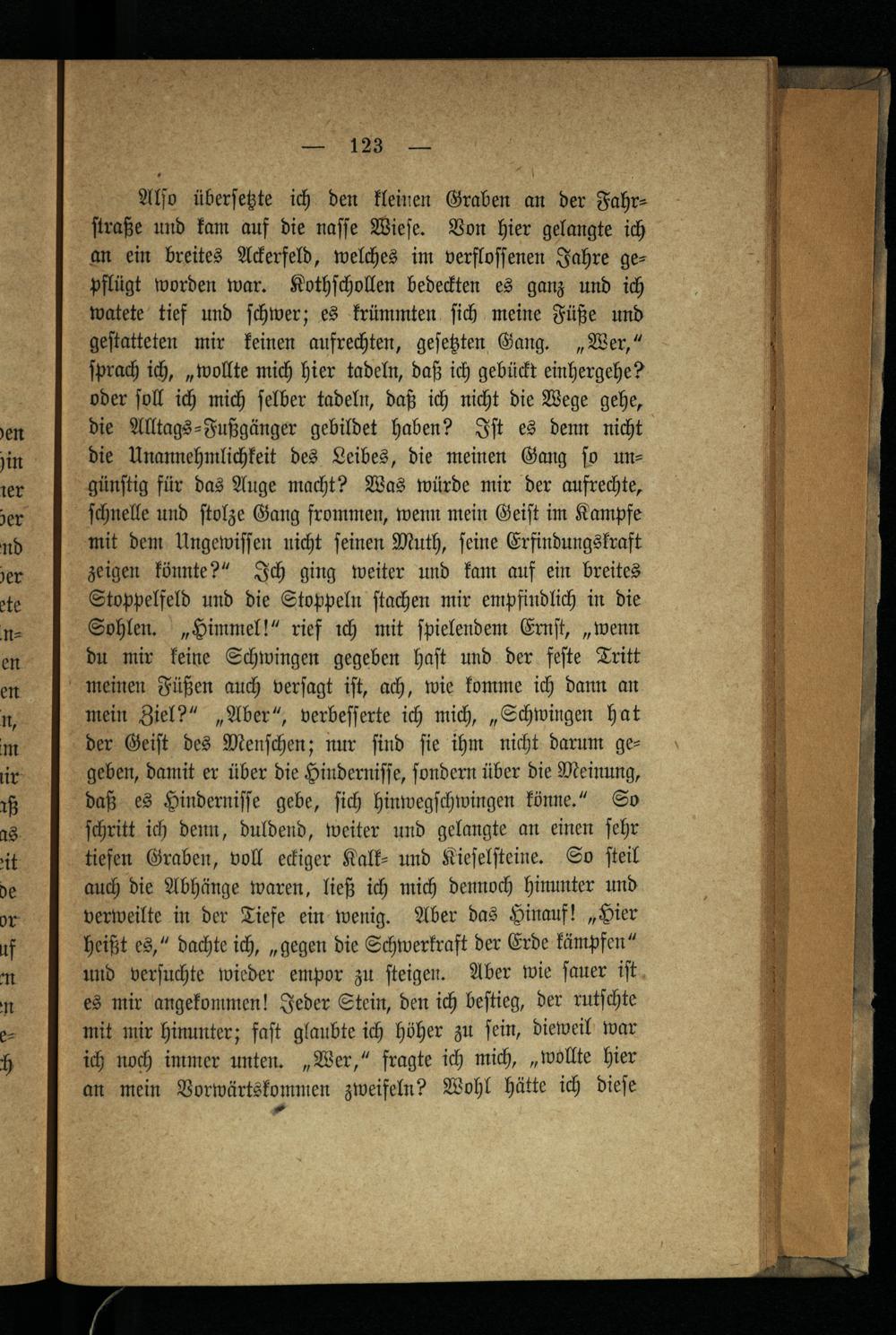 Alſo überſetzte ich den kleinen Graben an der Fahrſtraße und kam auf die naſſe Wieſe. Von hier gelangte ich an ein breites Ackerfeld, welches im verfloſſenen Jahre gepflügt worden war. Kothſchollen bedeckten es ganz und ich watete tief und ſchwer; es krümmten ſich meine Füße und geſtatteten mir keinen aufrechten, geſetzten Gang.„Wer,“ ſprach ich,„wollte mich hier tadeln, daß ich gebückt einhergehe? oder ſoll ich mich ſelber tadeln, daß ich nicht die Wege gehe, die Alltags- Fußgänger gebildet haben? Iſt es denn nicht die Unannehmlichkeit des Leibes, die meinen Gang ſo ungünſtig für das Auge macht? Was würde mir der aufrechte, ſchnelle und ſtolze Gang frommen, wenn mein Geiſt im Kampfe mit dem Ungewiſſen nicht ſeinen Muth, ſeine Erfindungskraft zeigen könnte?“ Ich ging weiter und kam auf ein breites Stoppelfeld und die Stoppeln ſtachen mir empfindlich in die Sohlen.„Himmel!“ rief ich mit ſpielendem Ernſt,„wenn du mir keine Schwingen gegeben haſt und der feſte Tritt meinen Füßen auch verſagt iſt, ach, wie komme ich dann an mein Ziel?“„Aber“, verbeſſerte ich mich,„Schwingen hat der Geiſt des Menſchen; nur find fie ihm nicht darum gegeben, damit er über die Hinderniſſe, ſondern über die Meinung, daß es Hinderniſſe gebe, ſich hinwegſchwingen könne.“ So ſchritt ich denn, duldend, weiter und gelangte an einen ſehr tiefen Graben, voll eckiger Kalk- und Kieſelſteine. So ſteil auch die Abhänge waren, ließ ich mich dennoch hinunter und verweilte in der Tiefe ein wenig. Aber das Hinauf!„Hier heißt es,“ dachte ich, gegen die Schwerkraft der Erde kämpfen“ und verſuchte wieder empor zu ſteigen. Aber wie ſauer iſt es mir angekommen! Jeder Stein, den ich beſtieg, der rutſchte mit mir hinunter; faſt glaubte ich höher zu ſein, dieweil war ich noch immer unten.„Wer,“ fragte ich mich,„wollte hier an mein Vorwärtskommen zweifeln? Wohl hätte ich dieſe x