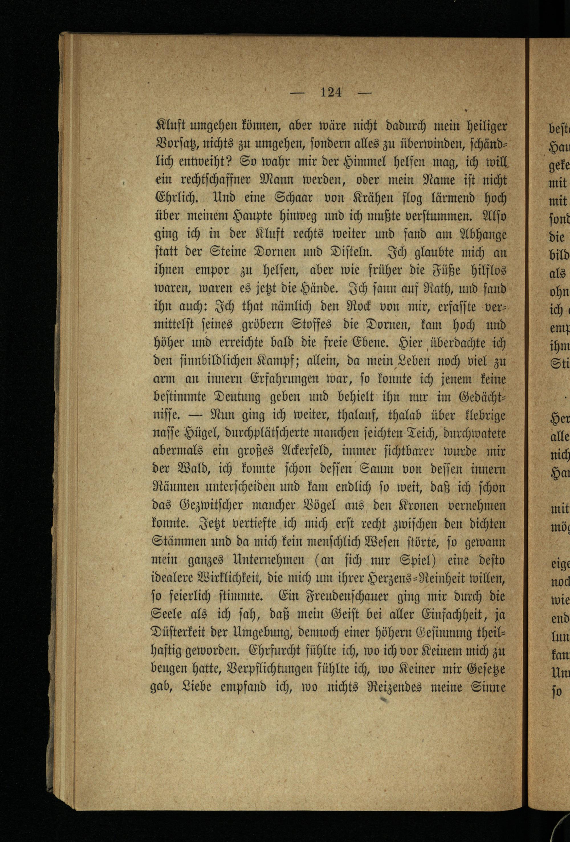 Kluft umgehen können, aber wäre nicht dadurch mein heiliger Vorſatz, nichts zu umgehen, ſondern alles zu überwinden, ſchändlich entweiht? So wahr mir der Himmel helfen mag, ich will ein rechtſchaffner Mann werden, oder mein Name iſt nicht Ehrlich. Und eine Schaar von Krähen flog lärmend hoch über meinem Haupte hinweg und ich mußte verſtummen. Alſo ging ich in der Kluft rechts weiter und fand am Abhange ſtatt der Steine Dornen und Diſteln. Ich glaubte mich an ihnen empor zu helfen, aber wie früher die Füße hilflos waren, waren es jetzt die Hände. Ich ſann auf Rath, und fand ihn auch: Ich that nämlich den Rock von mir, erfaſſte ver mittelſt ſeines gröbern Stoffes die Dornen, kam hoch und höher und erreichte bald die freie Ebene. Hier überdachte ich den ſinnbildlichen Kampf; allein, da mein Leben noch viel zu arm an innern Erfahrungen war, ſo konnte ich jenem keine beſtimmte Deutung geben und behielt ihn nur im Gedächt niſſe. — Nun ging ich weiter, thalauf, thalab über klebrige naſſe Hügel, durchplätſcherte manchen ſeichten Teich, durchwatete abermals ein großes Ackerfeld, immer ſichtbarer wurde mir der Wald, ich konnte ſchon deſſen Saum von deſſen innern Räumen unterſcheiden und kam endlich ſo weit, daß ich ſchon das Gezwitſcher mancher Vögel aus den Kronen vernehmen konnte. Jetzt vertiefte ich mich erſt recht zwiſchen den dichten Stämmen und da mich kein menſchlich Weſen ſtörte, ſo gewann mein ganzes Unternehmen(an ſich nur Spiel) eine deſto idealere Wirklichkeit, die mich um ihrer Herzens⸗-Reinheit willen, ſo feierlich ſtimmte. Ein Freudenſchauer ging mir durch die Seele als ich ſah, daß mein Geiſt bei aller Einfachheit, ja Düſterkeit der Umgebung, dennoch einer höhern Geſinnung theilhaftig geworden. Ehrfurcht fühlte ich, wo ich vor Keinem mich zu beugen hatte, Verpflichtungen fühlte ich, wo Keiner mir Geſetze gab, Liebe empfand ich, wo nichts Reizendes meine Sinne