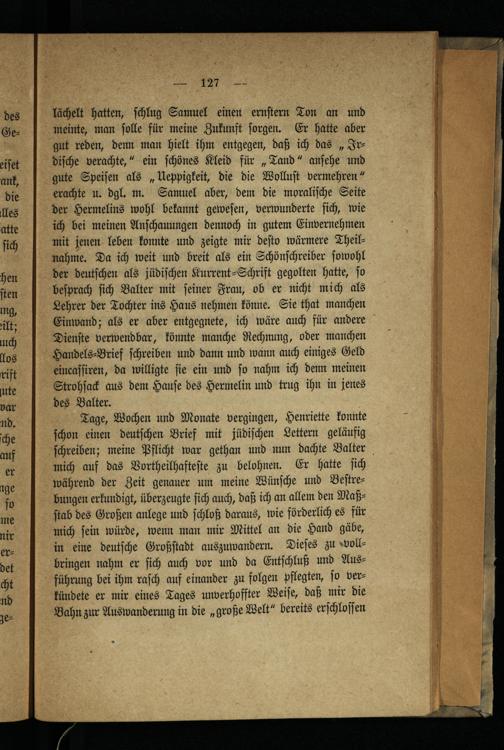 lächelt hatten, ſchlug Samuel einen ernſtern Ton an und meinte, man ſolle für meine Zukunft ſorgen. Er hatte aber gut reden, denn man hielt ihm entgegen, daß ich das ‚„Irdiſche verachte,“ ein ſchönes Kleid für„Tand“ anſehe und gute Speiſen als„Ueppigkeit, die die Wolluſt vermehren“ erachte u. dgl. m. Samuel aber, dem die moraliſche Seite der Hermelins wohl bekannt geweſen, verwunderte ſich, wie ich bei meinen Anſchauungen dennoch in gutem Einvernehmen mit jenen leben konnte und zeigte mir deſto wärmere Theilnahme. Da ich weit und breit als ein Schönſchreiber ſowohl der deutſchen als jüdiſchen Kurrent-Schrift gegolten hatte, ſo beſprach ſich Balter mit ſeiner Frau, ob er nicht mich als Lehrer der Tochter ins Haus nehmen könne. Sie that manchen Einwand; als er aber entgegnete, ich wäre auch für andere Dienſte verwendbar, könnte manche Rechnung, oder manchen Handels⸗-Brief ſchreiben und dann und wann auch einiges Geld eincaſſtren, da willigte fie ein und fo nahm ich denn meinen Strohſack aus dem Hauſe des Hermelin und trug ihn in jenes des Balter. Tage, Wochen und Monate vergingen, Henriette konnte ſchon einen deutſchen Brief mit jüdiſchen Lettern geläufig ſchreiben; meine Pflicht war gethan und nun dachte Balter mich auf das Vortheilhafteſte zu belohnen. Er hatte ſich während der Zeit genauer um meine Wünſche und Beſtrebungen erkundigt, überzeugte ſich auch, daß ich an allem den Maßſtab des Großen anlege und ſchloß daraus, wie förderlich es für mich ſein würde, wenn man mir Mittel an die Hand gäbe, in eine deutſche Großſtadt auszuwandern. Dieſes zu vollbringen nahm er ſich auch vor und da Entſchluß und Ausführung bei ihm raſch auf einander zu folgen pflegten, ſo verkündete er mir eines Tages unverhoffter Weiſe, daß mir die Bahn zur Auswanderung in die„große Welt“ bereits erſchloſſen