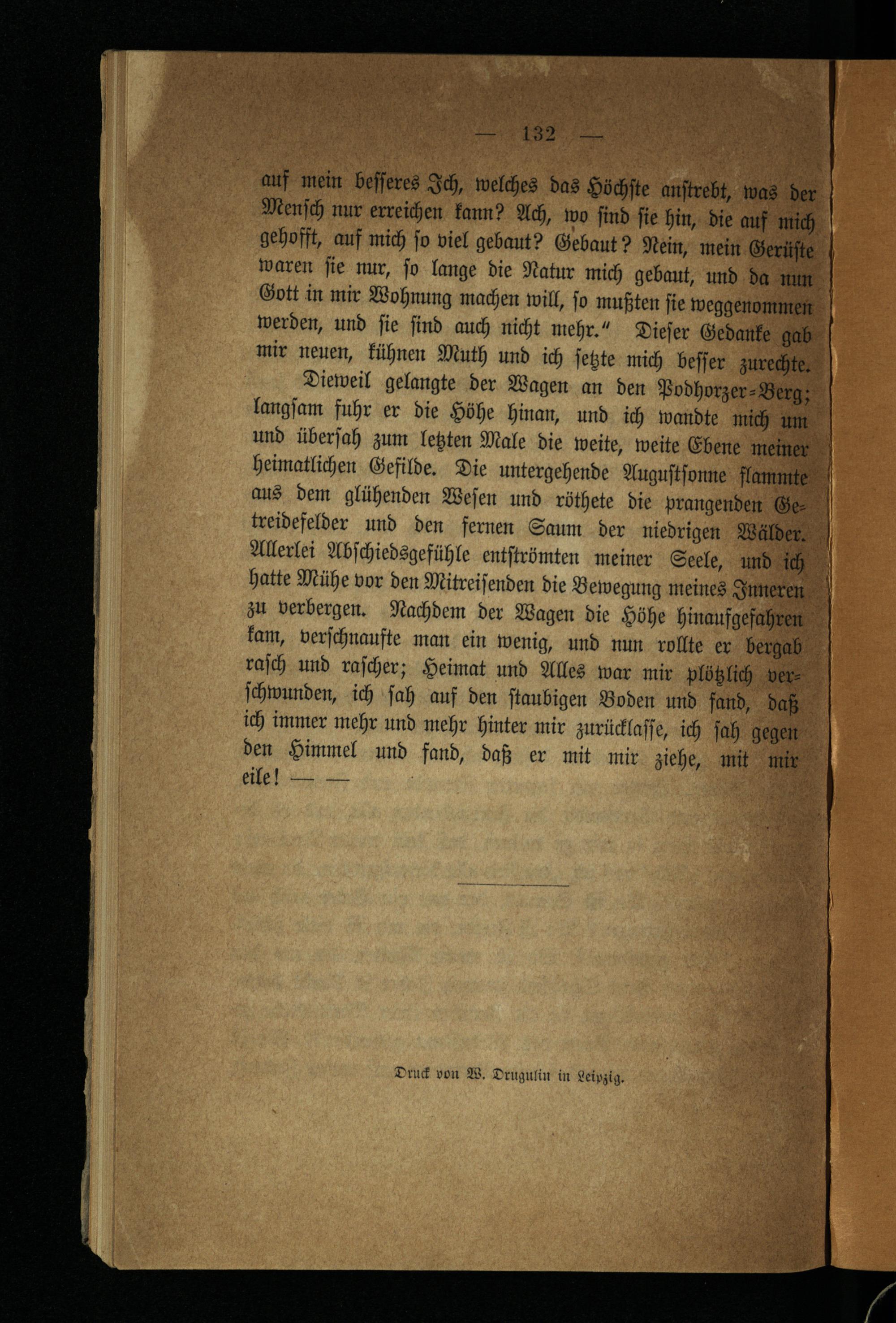 Dieweil gelangte der Wagen an den Podhorzer⸗ Berg; langſam fuhr er die Höhe hinan, und ich wandte mich um und überſah zum letzten Male die weite, weite Ebene meiner heimatlichen Gefilde. Die untergehende Auguſtſonne flammte aus dem glühenden Weſen und röthete die prangenden Ge| treidefelder und den fernen Saum der niedrigen Wälder. Allerlei Abſchiedsgefühle entſtrömten meiner Seele, und ich hatte Mühe vor den Mitreiſenden die Bewegung meines Inneren zu verbergen. Nachdem der Wagen die Höhe hinaufgefahren kam, verſchnaufte man ein wenig, und nun rollte er bergab raſch und raſcher; Heimat und Alles war mir plötz lich verſchwunden, ich ſah auf den ſtaubigen Boden und fand, daß ich immer mehr und mehr hinter mir zurücklaſſe, ich ſah gegen den Himmel und fand, daß er mit mir ziehe, mit mir eile!——