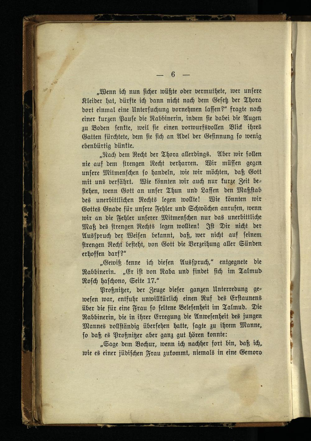 Proßnitzer, der Zeuge dieser ganzen Unterredung gewesen war, entfuhr unwillkürlich einen Ruf des Erstaunens über die für eine Frau so seltene Belesenheit im Talmud . Die Rabbinerin, die in ihrer Erregung die Anwesenheit des jungen Mannes vollständig übersehen hatte, sagte zu ihrem Manne, so daß es Proßnitzer aber ganz gut hören konnte: