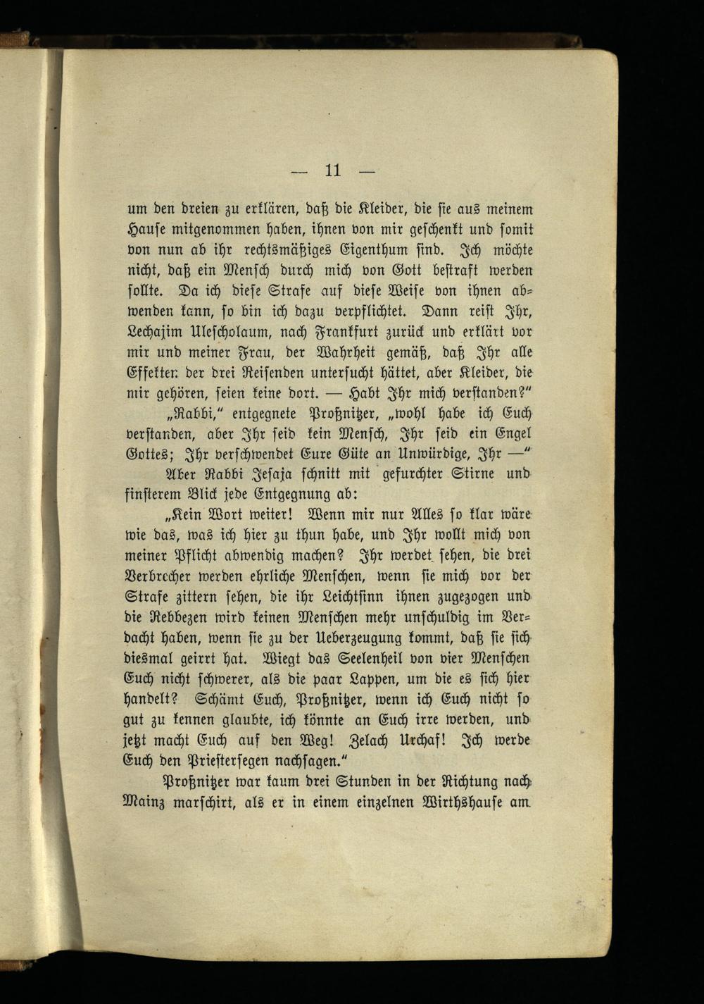 um den dreien zu erklären, daß die Kleider, die sie aus meinem Hause mitgenommen haben, ihnen von mir geschenkt und somit von nun ab ihr rechtsmäßiges Eigenthum sind. Ich möchte nicht, daß ein Mensch durch mich von Gott bestraft werden sollte. Da ich diese Strafe auf diese Weise von ihnen abwenden kann, so bin ich dazu verpflichtet. Dann reist Ihr, Lechajim Ulcscholaum, nach Frankfurt zurück und erklärt vor mir und meiner Frau, der Wahrheit gemäß, daß Ihr alle Effekten der drei Reisenden untersucht hättet, aber Kleider, die nur gehören, seien keine dort. — Habt Ihr mich verstanden?"
