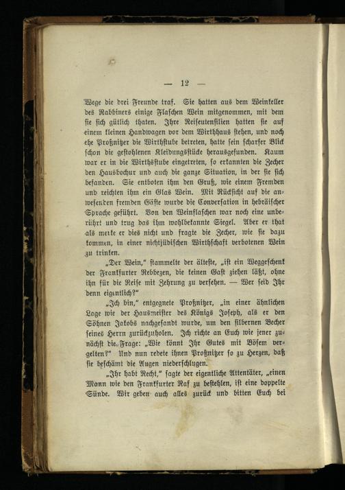 Wege die drei Freunde traf. Sie hatten aus dem Weinkeller des Rabbiners einige Flaschen Wein mitgenommen, mit dem sie sich gütlich thaten. Ihre Reiseutensilien hatten sie auf einem kleinen Handwagen vor dem Wirthhaus stehen, und noch ehe Proßnitzer die Wirthstube betreten, hatte sein scharfer Blick schon die gestohlenen Kleidungsstücke herausgefunden. Kaum war er in die Wirthsstube eingetreten, so erkannten die Zecher den Hausbochur und auch die ganze Situation, in der sie sich befanden. Sie entboten ihm den Gruß, wie einem Fremden und reichten ihm ein Glas Wein. Mit Rücksicht auf die anwesenden fremden Gäste wurde die Konversation in hebräischer Sprache geführt. Von den Weinflaschen war noch eine unberührt und trug das ihm wohlbekannte Siegel. Aber er that als merke er dies nicht und fragte die Zecher, wie sie dazu kommen, in einer nichtjüdischen Wirtschaft verbotenen Wein .zu trinken.