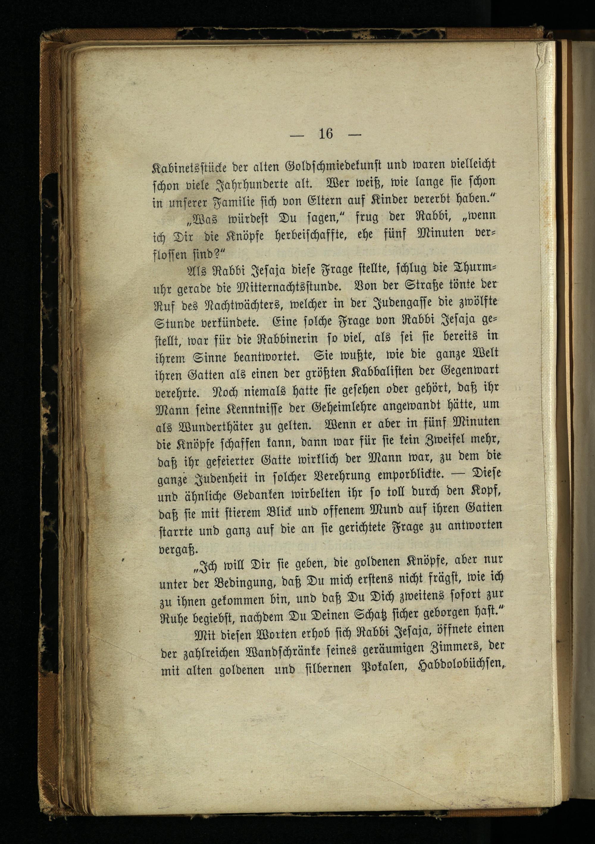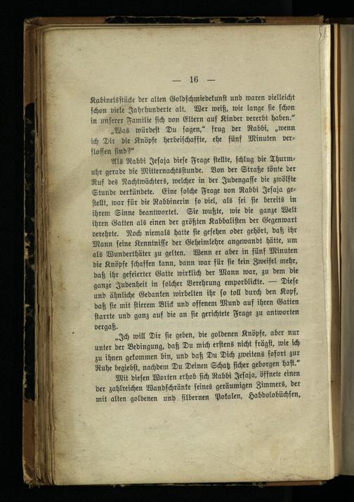 Als Rabbi Jesaja diese Frage stellte, schlug die Thurmuhr gerade die Mitternachtsstunde. Von der Straße tönte der Ruf des Nachtwächters, welcher in der Judengasse die zwölfte Stunde verkündete. Eine solche Frage von Rabbi Jesaja gestellt, war für die Rabbinerin so viel, als sei sie bereits in ihrem Sinne beantwortet. Sie wußte, wie die ganze Welt ihren Gatten als einen der größten Kabbalisten der Gegenwart verehrte. Noch niemals hatte sie gesehen oder gehört, daß ihr Mann seine Kenntnisse der Geheimlehre angewandt hätte, um als Wunderthäter zu gelten. Wenn er aber in fünf Minuten die Knöpft schaffen kann, dann war für sie kein Zweifel mehr, daß ihr gefeierter Gatte wirklich der Mann war, zu dem die ganze Judenheit in solcher Verehrung emporblickte. — Diese und ähnliche Gedanken wirbelten ihr so toll durch den Kopf, daß sie mit stierem Blick und offenem Mund auf ihren Gatten starrte und ganz auf die an sie gerichtete Frage zu antworten vergaß.