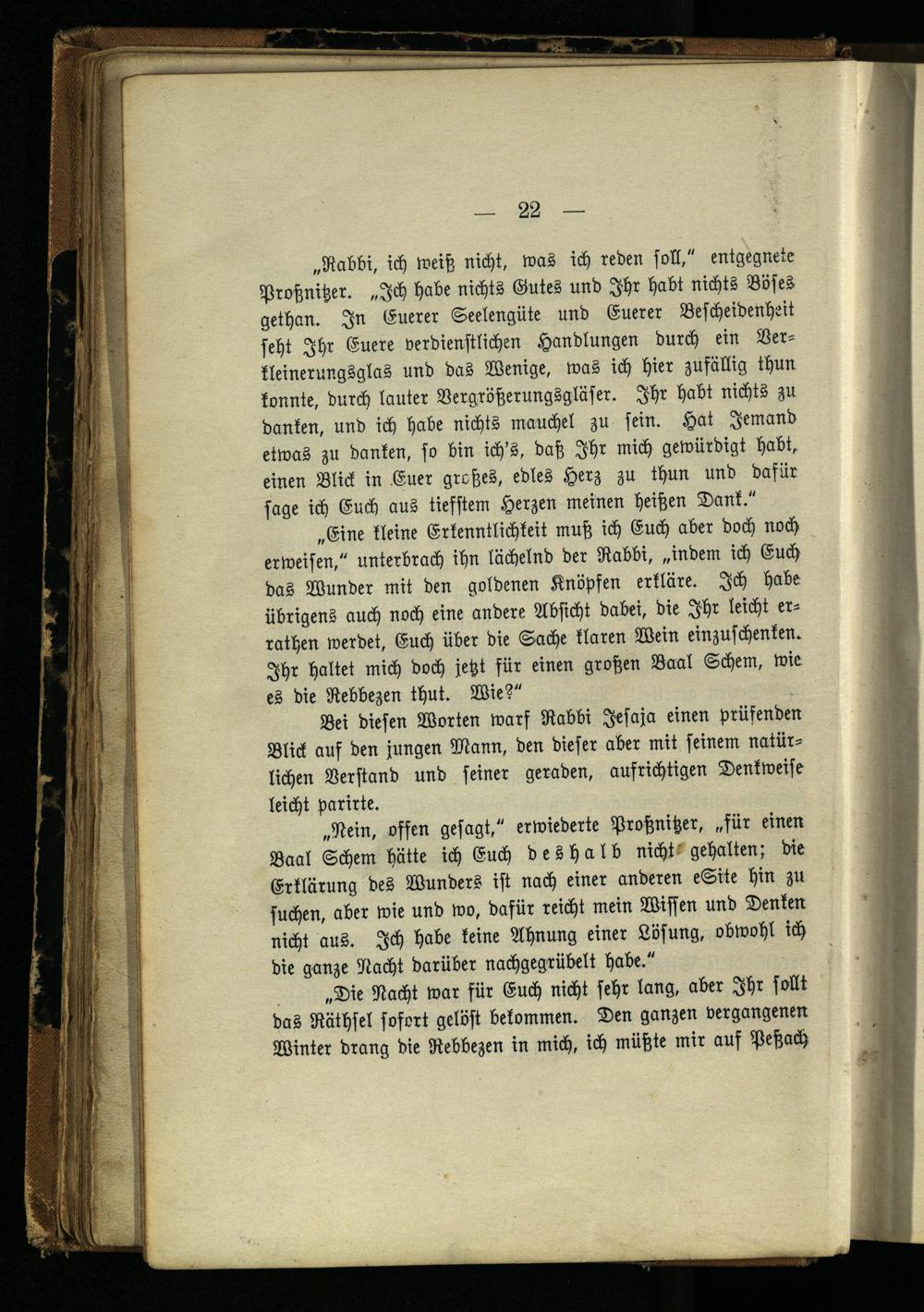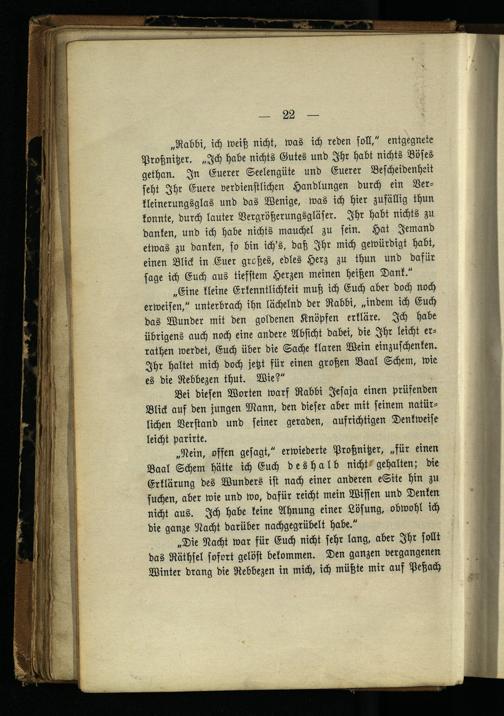„Die Nacht war für Euch nicht sehr lang, aber Ihr sollt das Räthsel sofort gelöst bekommen. Den ganzen vergangenen Winter drang die Rebbezen in mich, ich müßte mir auf Peßach