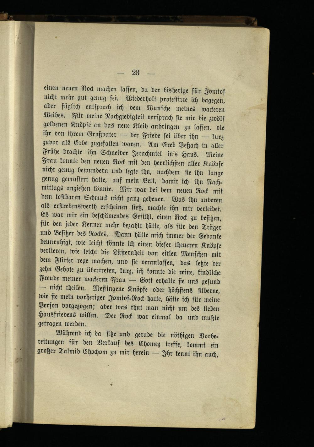 einen neuen Rock machen lassen, da der bisherige für Jomtof nicht mehr gut genug sei. Wiederholt protestirte ich dagegen, aber füglich entsprach ich dem Wunsche meines wackeren Weibes. Für meine Nachgiebigkeit versprach sie mir die zwölf goldenen Knöpfe an das neue Kleid anbringen zu lassen, die ihr von ihrem Großvater — der Friede sei über ihn — kurz zuvor als Erbe zugefallen waren. Am Ereb Peßach in aller Frühe brachte ihn Schneider Jerachmiel in's Haus. Meine Frau konnte den neuen Rock mit den herrlichsten aller Knöpfe nicht genug bewundern und legte ihn, nachdem sie ihn lange genug gemustert hatte, aus mein Bett, damit ich ihn Nachmittags anziehen könnte. Mir war bei dem neuen Rock mit dem kostbaren Schmuck nicht ganz geheuer. Was ihn anderen als erstrebenswerth erscheinen ließ, machte ihn mir verleidet. Es war mir ein beschämendes Gefühl, einen Rock zu besitzen, für den jeder Kenner mehr bezahlt hätte, als für den Träger und Besitzer des Rockes. Dann hätte mich immer der Gedanke beunruhigt, wie leicht könnte ich einen dieser theueren Knöpfe verlieren, wie leicht die Lüsternheit von eitlen Menschen mit dem Flitter rege machen, und sie veranlaßen, das letzte der zehn Gebote zu übertreten, kurz, ich konnte die reine, kindliche Freude meiner wackeren Frau — Gott erhalte sie uns gesund — nicht theilen. Messingene Knöpfe oder höchstens silberne, wie sic mein vorheriger Jomtof-Rock hatte, hätte ich für meine Person vorgezoaen; aber was thut man nicht um des lieben Hausfriedens willen. Der Rock war einmal da und mußte getragen werden.