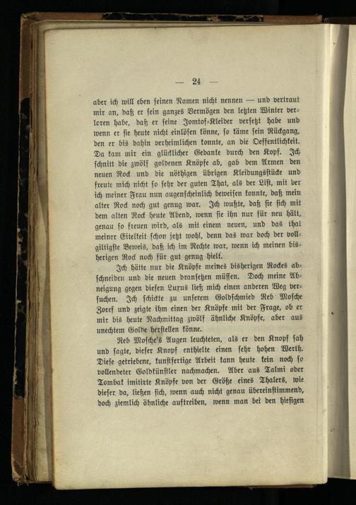 Ich hätte nur die Knöpfe meines bisherigen Rockes abschneiden und die neuen dransetzen müssen. Doch meine Abneigung gegen diesen Luxus ließ mich einen anderen Weg versuchen. Ich schickte zu unserem Goldschmied Reb Mosche Zores und zeigte ihm einen der Knöpfe mit der Frage, ob er mir bis heute Nachmittag zwölf ähnliche Knöpfe, aber aus unechtem Golde Herstellen könne.