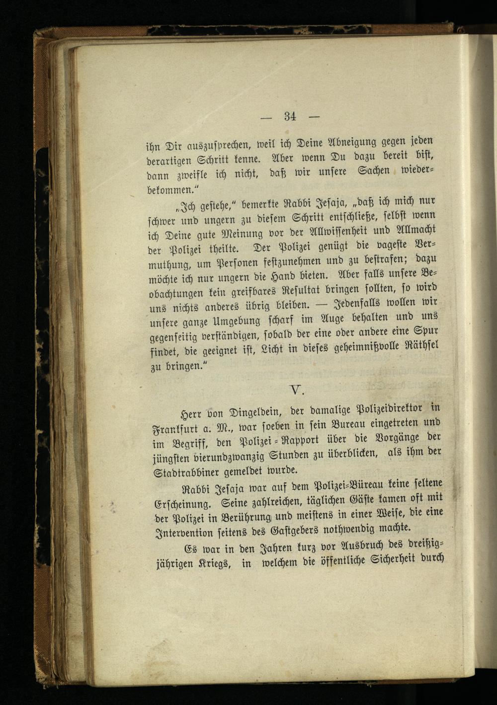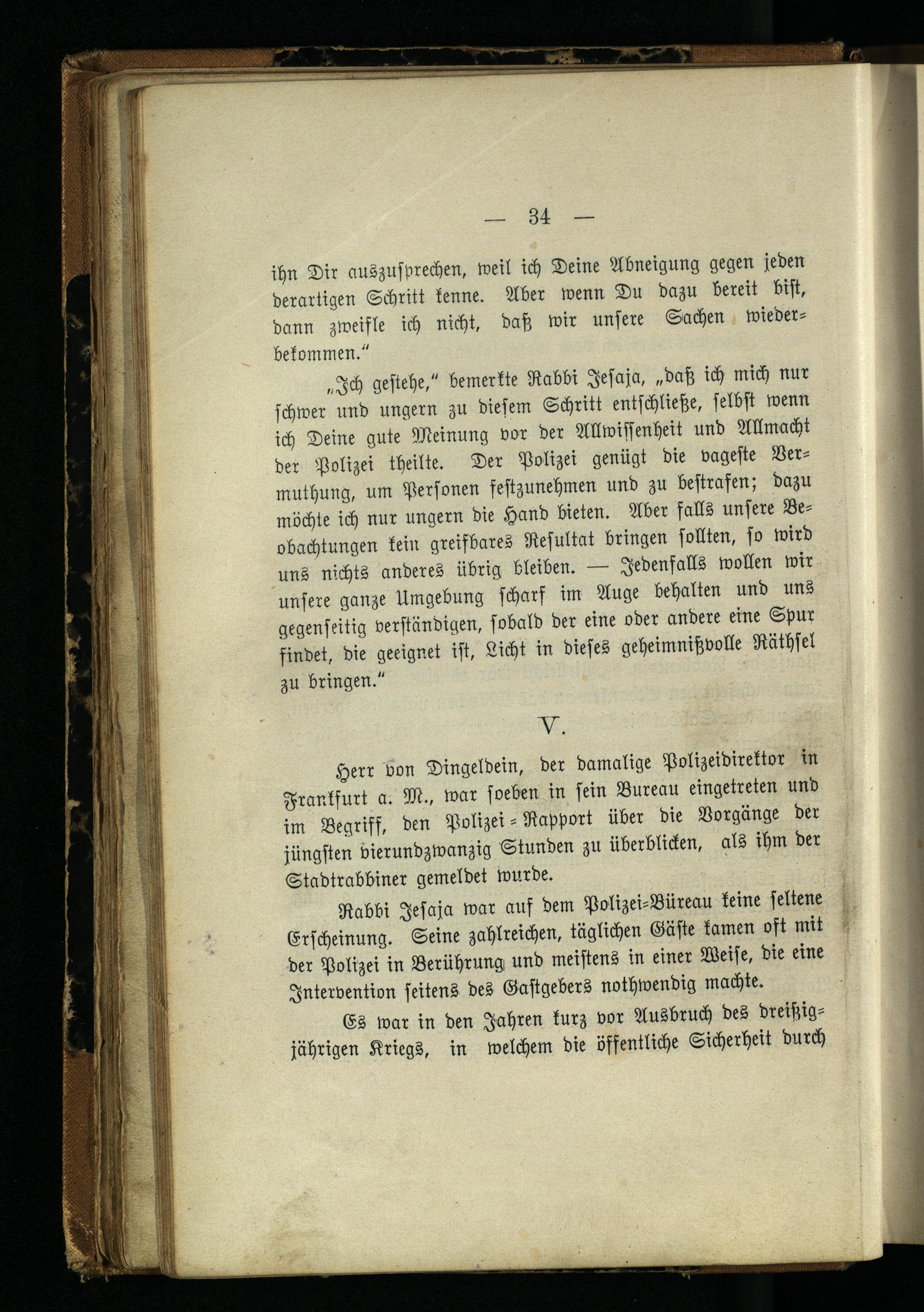 Herr von Dingeldein, der damalige Polizeidirektor in Frankfurt a. M., war soeben in sein Bureau eingetreten und im Begriff, den Polizei-Rapport über die Vorgänge der jüngsten vierundzwanzig Stunden zu überblicken, als ihm der Stadtrabbiner gemeldet wurde.