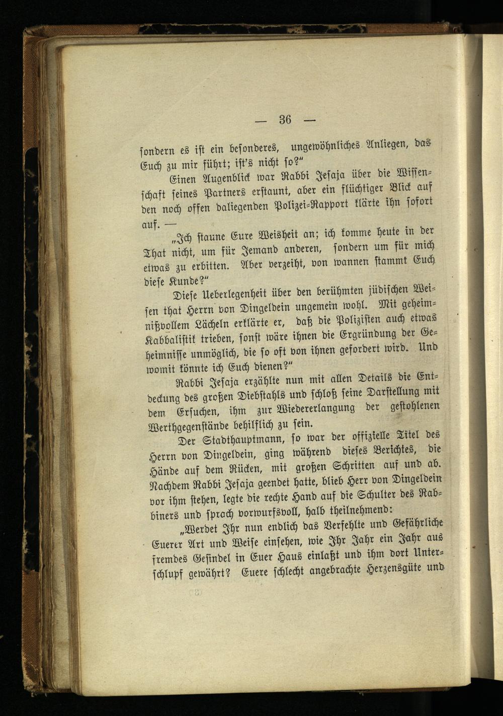 Der Stadthauptmann, so war der offizielle Titel des Herrn von Dingeldein, ging während dieses Berichtes, die Hände auf dem Rücken, mit großen Schritten auf und ab. Nachdem Rabbi Jesaja geendet hatte, blieb Herr von Dingeldein vor ihm stehen, legte die rechte Hand auf die Schulter des Rabbiners und sprach vorwurfsvoll, halb theilnehmend: