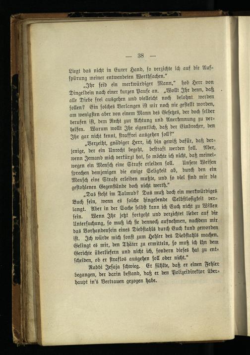 „Das steht im Talmud ? Das muß doch ein merkwürdiges. Buch sein, wenn es solche hingebende Selbstlosigkeit verlangt. Aber in der Sache selbst kann ich Euch nicht zu Willen sein. Wenn Ihr jetzt fortgeht und verzichtet lieber auf die Untersuchung, so muß ich sie dennoch aufnehmen, nachdem mir das Vorhandensein eines Diebstahls durch Euch kund geworden ist. Ich würde mich sonst zum Hehler des Diebstahls machen. Gelingt es mir, den Thäter zu ermitteln, so muß ich ihn dem Gerichte überliefern und nicht ich, sondern dieses hat zu entscheiden, ob er straflos ausgehen soll oder nicht."