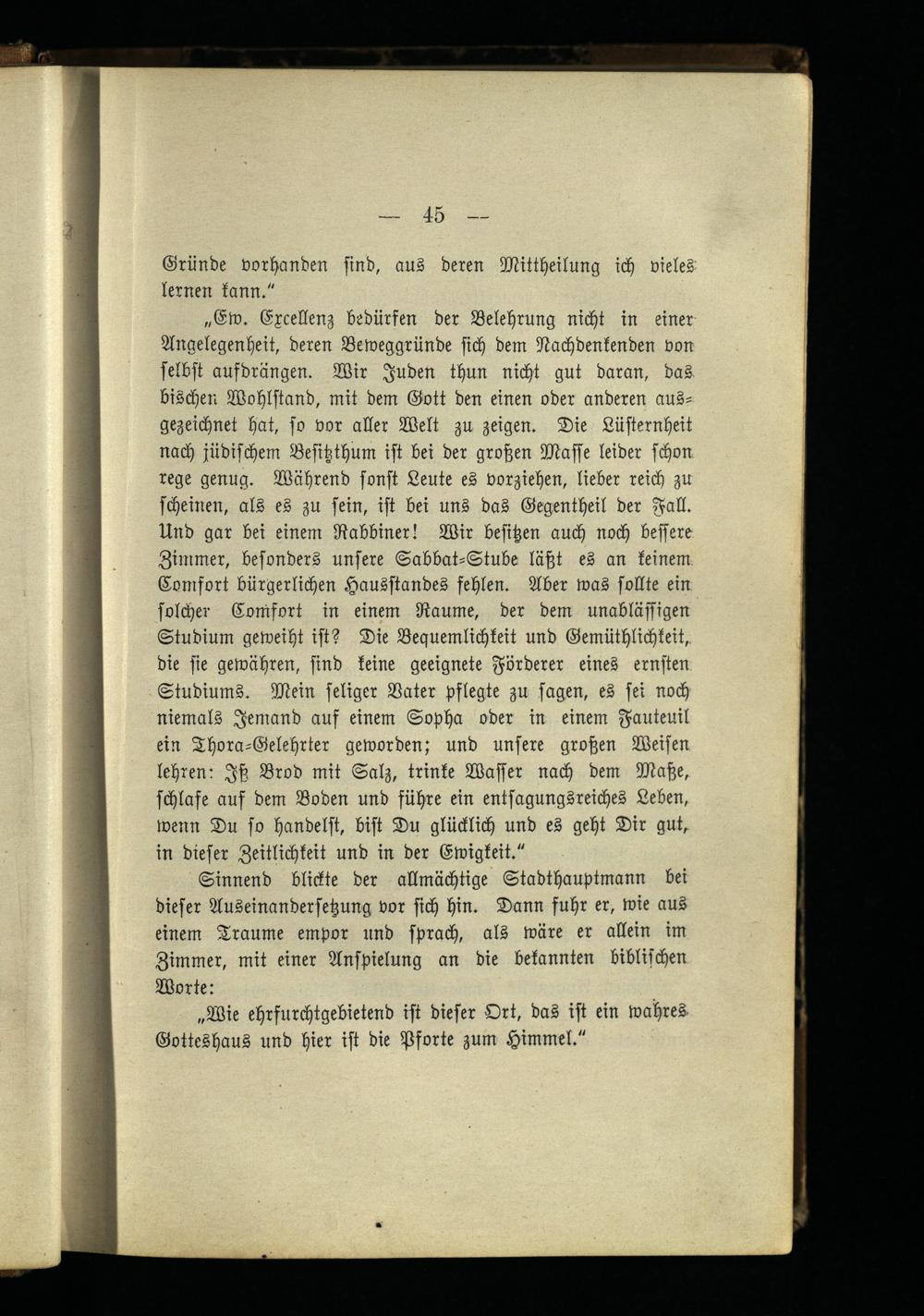 „Ew. Excellenz bedürfen der Belehrung nicht in einer Angelegenheit, deren Beweggründe sich dem Nachdenkenden von selbst aufdrängen. Wir Juden thun nicht gut daran, das bischen Wohlstand, mit dem Gott den einen oder anderen ausgezeichnet hat, so vor aller Welt zu zeigen. Die Lüsternheit nach jüdischem Besitzthum ist bei der großen Masse leider schon rege genug. Während sonst Leute es vorziehen, lieber reich zu scheinen, als es zu sein, ist bei uns das Gegentheil der Fall. Und gar bei einem Rabbiner! Wir besitzen auch noch bessere Zimmer, besonders unsere Sabbat-Stube läßt es an keinem Comfort bürgerlichen Hausstandes fehlen. Aber was sollte ein solcher Comfort in einem Raume, der dem unablässigen Studium geweiht ist? Die Bequemlichkeit und Gemiithlichkeit,, die sie gewähren, sind keine geeignete Förderer eines ernsten Studiums. Mein seliger Vater pflegte zu sagen, es sei noch niemals Jemand auf einem Sopha oder in einem Fauteuil ein Thora-Gelehrter geworden; und unsere großen Weisen lehren: Iß Brod mit Salz, trinke Wasser nach dem Maße, schlafe auf dem Boden und führe ein entsagungsreiches Leben, wenn Du so handelst, bist Du glücklich und es geht Dir gut, in dieser Zeitlichkeit und in der Ewigkeit."
