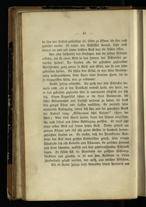 Rabbi Jesaja erbleichte. So groß war sein Schrecken damals nicht, als er den Diebstahl entdeckt hatte, wie heute, wo er das gestohlen geglaubte Gut so unerwartet plötzlich vor sich sah. Einen Augenblick schien er die klare Seelenruhe, die kühle Besonnenheit und Umsicht verloren zu haben, die sonst sein ganzes Thun und Lassen verklärte. Er verrieth seine namenlose Aufregung, indem sich ihm aus der gepreßten Brust der Ausruf rang: „Ribbaunau schel Aulom!" (Herr der Welt.) Aber diese Worte hatten, kaum den Lippen entglitten, ihn auch sofort aus seiner Bestürzung gerissen. Er warf jetzt einen ersten Blick auf seinen hohen Gast. Dieser zitterte am ganzen Körper und rief alle guten Geister in keuchend hervorgepreßten Lauten an. Er wußte, daß der Frankfurter Rabbiner den Ruf eines großen Kabbalisten genoß, seine erregte Phantasie sah alle Kobolde und Dämonen, die zwischen Himmel und Erde schweben, neckisch aus dem geheimnißvollen Schranke lugen. Er fühlte sich im Bannkreis des größten Schwarzkünstlers und glaubte, er sei von dem Rabbiner in diesen Zauberkreis gelockt worden, wer weiß, aus welchen Absichten.