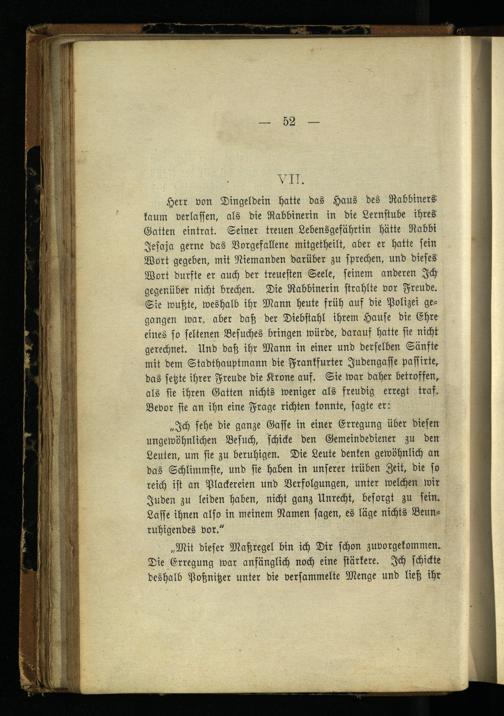 „Ich sehe die ganze Gaste in einer Erregung über diesen ungewöhnlichen Besuch, schicke den Gemeindediener zu den Leuten, um sie zu beruhigen. Die Leute denken gewöhnlich an das Schlimmste, und sie haben in unserer trüben Zeit, die so reich ist an Plackereien und Verfolgungen, unter welchen wir Juden zu leiden haben, nicht ganz Unrecht, besorgt zu sein. Lasse ihnen also in meinem Namen sagen, es läge nichts Beunruhigendes vor."