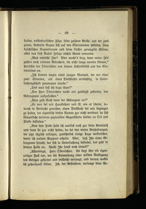 kalten, aristokratischen Züge, seine goldene Brille, aus der zwei graue, stechende Augen sich auf den Eintretenden hefteten, seine buschischen Augenbrauen und seine finster gerunzelte Stirne, alles das ließ Rabbi Jesaja nichts Gutes erwarten.