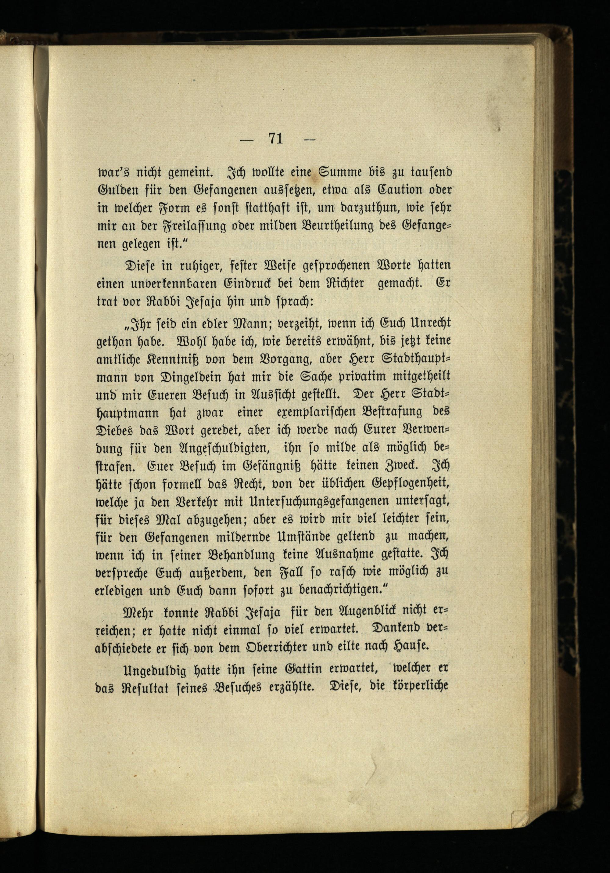 „Ihr seid ein edler Mann; verzeiht, wenn ich Euch Unrecht gethan habe. Wohl habe ich, wie bereits erwähnt, bis jetzt keine amtliche Kenntniß von dem Vorgang, aber Herr Stadthauptmann von Dingeldein hat mir die Sache privatim mitgetheilt und mir Eueren Besuch in Aussicht gestellt. Der Herr Stadthauptmann hat zwar einer exemplarischen Bestrafung des Diebes das Wort geredet, aber ich werde nach Eurer Verwendung für den Angeschuldigten, ihn so milde als möglich bestrafen. Euer Besuch im Gefängniß hätte keinen Zweck. Ich hätte schon formell das Recht, von der üblichen Gepflogenheit, welche ja den Verkehr mit Untersuchungsgefangenen untersagt, für dieses Mal abzugehen; aber es wird mir viel leichter sein, für den Gefangenen mildernde Umstände geltend zu machen, wenn ich in seiner Behandlung keine Ausnahme gestatte. Ich verspreche Euch außerdem, den Fall so rasch wie möglich zu erledigen und Euch dann sofort zu benachrichtigen."