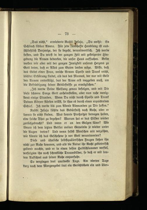 „Das nicht," erwiederte Rabbi Jesaja , „Du weißt: En Schliach lidbar Awera. Für jede sündhafte Handlung ist ausschließlich Derjenige, der sie begeht, verantwortlich. Ich werde fasten, und Du wirst in der ganzen Zeit mit gesteigerter Hingebung die Armen bedenken, die unser Haus aufsuchen. Beide wollen wir aber mit der ganzen Innigkeit unseres Herzens zu Gott beten, daß er Alles zum Guten lenken möge. Wisse, daß das Gebet einer Frau, welche Armen Speise und Trank reicht, leichter Erklärung findet, als das des Mannes, der nur mit Geld den Armen unterstützt, das der Arme erst weggeben muß, um die Befriedigung seiner Bedürfnisse zu ermöglichen."