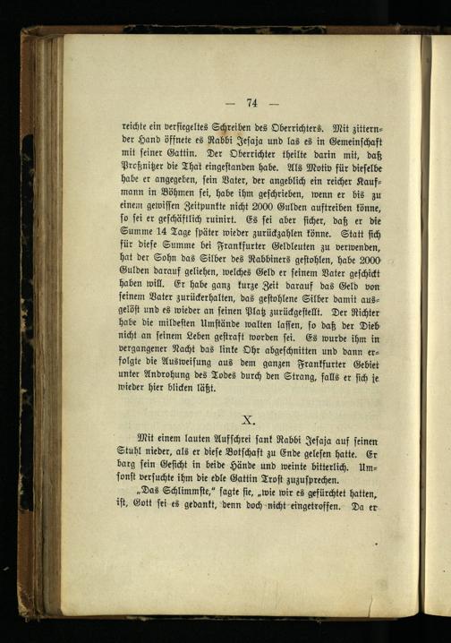 reichte ein versiegeltes Schreiben des Oberrichters. Mit zitternder Hand öffnete es Rabbi Jesaja und las es in Gemeinschaft mit seiner Gattin. Der Oberrichter theilte darin mit, daß Prcßnitzer die That eingestanden habe. Als Motiv für dieselbe habe er angegeben, fein Vater, der angeblich ein reicher Kaufmann in Böhmen sei, habe ihm geschrieben, wenn er bis zu einem gewissen Zeitpunkte nicht 2000 Gulden austreiben könne, so sei er geschäftlich ruinirt. Es sei aber sicher, daß er die Summe 14 Tage später wieder Zurückzahlen könne. Statt sich für diese Summe bei Frankfurter Geldleuten zu verwenden, hat der Sohn das Silber des Rabbiners gestohlen, habe 2000 Gulden darauf geliehen, welches Geld er feinem Vater geschickt haben will. Er habe ganz kurze Zeit darauf das Geld von seinem Vater zurückerhalten, das gestohlene Silber damit ausgelöst und es wieder an seinen Platz zurückgestellt. Der Richter habe die mildesten Umstände walten lassen, so daß der Dieb nicht an seinem Leben gestraft worden sei. Es wurde ihm in vergangener Nacht das linke Ohr abgeschnitten und dann erfolgte die Ausweisung aus dem ganzen Frankfurter Gebiet unter Androhung des Todes durch den Strang, falls er sich je wieder hier blicken läßt.