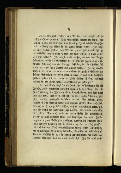 „Ereifert Euch nicht," unterbrach ihn besänftigend Rabbi Jesaja, „und empfangt zunächst meinen heißen Dank für die gute Meinung, die Ihr nach allem Vorgefallenen auch jetzt noch von mir habt. Ich weiß, daß Ihr in dieser guten Meinung zur Zeit ziemlich vereinzelt dastehen werdet. Um keinen Preis möchte ich das Verdienstliche, das meinem Fasten etwa anhastet, dadurch in Frag« gestellt wissen, daß es ausposaunt wird, um mir die Gunst der Menschen zuzuwenden. Es würde auch nicht viel helfen. Die mich nach der guten Seite hin beurtheilen, werden es auch ohnedies thun, und diejenigen, die meiüe Handlungsweise zum Schlechten auslegen, werden sich dadurch kaum eines besseren belehren lassen. Könnte ich aber wirklich zweifellos auf die von Euch vorgeschlagene Weise einen Umschwung der ungünstigen Gesinnung bewirken, ich möchte es nicht einmal. Man verdächtigt in mir ja keinen Unschuldigen, ich habe das Unrecht begangen, das man mir nachträgt. Ich bin auch nicht