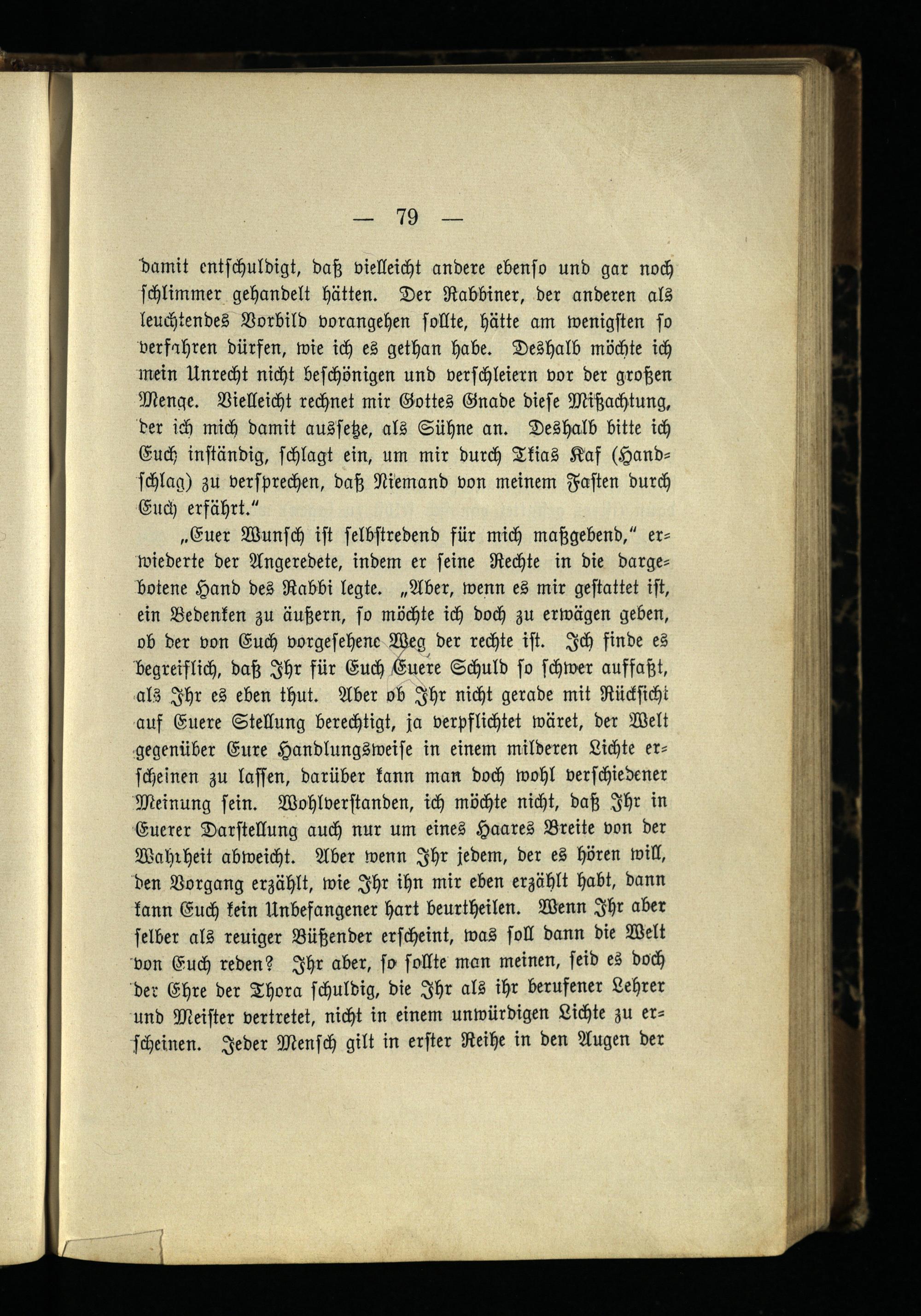 "damit entschuldigt, daß vielleicht andere ebenso und gar noch schlimmer gehandelt hätten. Der Rabbiner, der anderen als leuchtendes Vorbild vorangehen sollte, hätte am wenigsten so Verfahren dürfen, wie ich es gethan habe. Deshalb möchte ich mein Unrecht nicht beschönigen und verschleiern vor der großen Menge. Vielleicht rechnet mir Gottes Gnade diese Mißachtung, der ich mich damit aussetze, als Sühne an. Deshalb bitte ich Euch inständig, schlagt ein, um mir durch Tkias Kaf (Handschlag) zu versprechen, daß Niemand von meinem Fasten durch Euch erfährt."