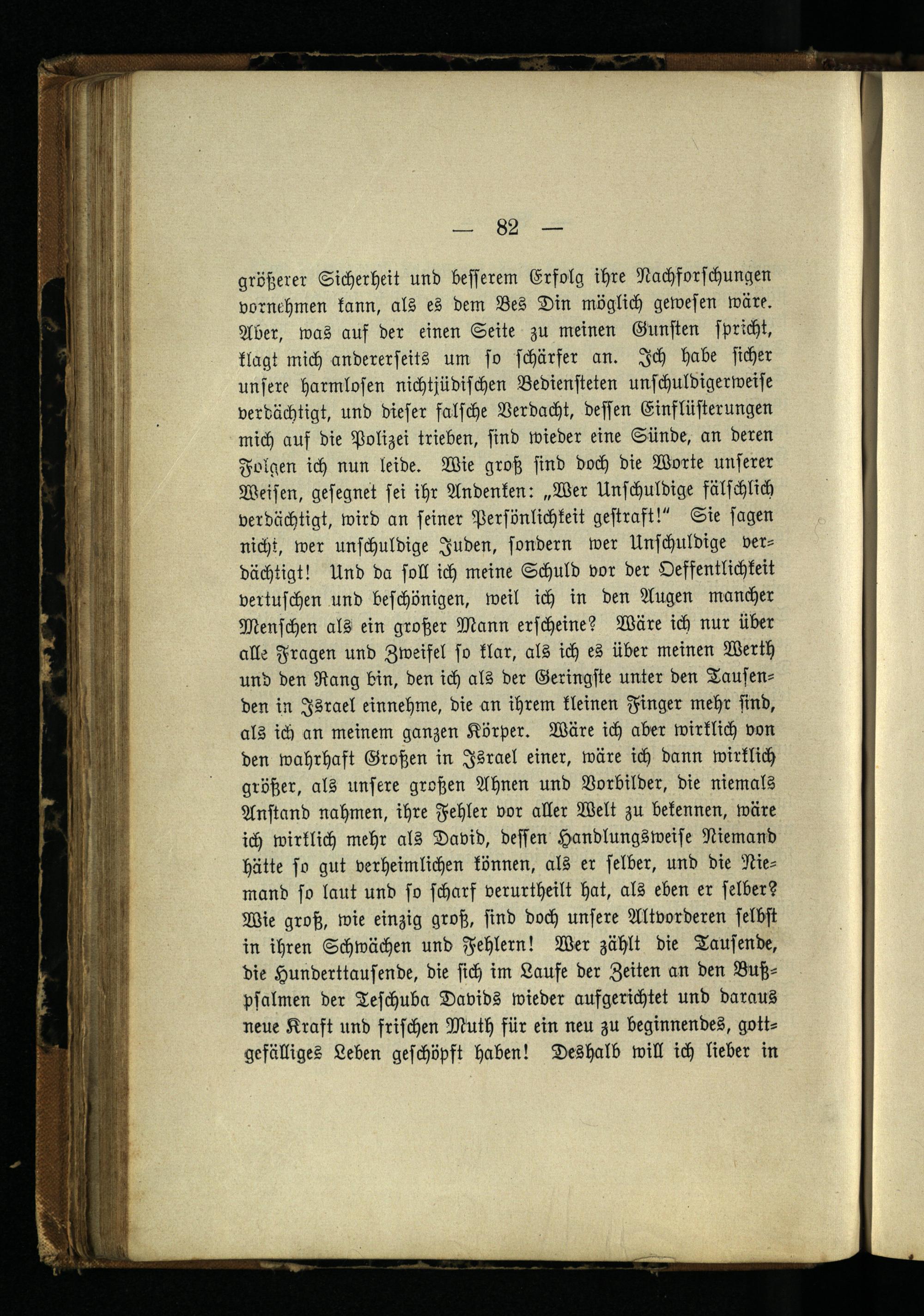 größerer Sicherheit und besserem Erfolg ihre Nachforschungen vornehmen kann, als es dem Bes Din möglich gewesen wäre. Aber, was aus der einen Seite zu meinen Gunsten spricht, klagt mich andererseits um so schärfer an. Ich habe sicher unsere harmlosen nichtjüdischen Bediensteten unschuldigerweise verdächtigt, und dieser falsche Verdacht, dessen Einflüsterungen mich auf die Polizei trieben, sind wieder eine Sünde, an deren Folgen ich nun leide. Wie groß sind doch die Worte unserer Weisen, gesegnet sei ihr Andenken: „Wer Unschuldige fälschlich verdächtigt, wird an seiner Persönlichkeit gestraft!" Sie sagen nicht, wer unschuldige Juden, sondern wer Unschuldige verdächtigt! Und da soll ich meine Schuld vor der Oeffentlichkeit vertuschen und beschönigen, weil ich in den Augen mancher Menschen als ein großer Mann erscheine? Wäre ich nur über alle Fragen und Zweifel so klar, als ich es über meinen Werth und den Rang bin, den ich als der Geringste unter den Tausenden in Israel einnehme, die an ihrem kleinen Finger mehr sind, als ich an meinem ganzen Körper. Wäre ich aber wirklich von den wahrhaft Großen in Israel einer, wäre ich dann wirklich größer, als unsere großen Ahnen und Vorbilder, die niemals Anstand nahmen, ihre Fehler vor aller Welt zu bekennen, wäre ich wirklich mehr als David, dessen Handlungsweise Niemand hätte so gut verheimlichen können, als er selber, und die Niemand so laut und so scharf verurtheilt hat, als eben er selber? Wie groß, wie einzig groß, sind doch unsere Altvorderen selbst in ihren Schwächen und Fehlern! Wer zählt die Tausende, die Hunderttausende, die sich im Laufe der Zeiten an den Bußpsalmen der Teschuba Davids wieder aufgerichtet und daraus neue Kraft und frischen Müth für ein neu zu beginnendes, gottgefälliges Leben geschöpft haben! Deshalb will ich lieber in