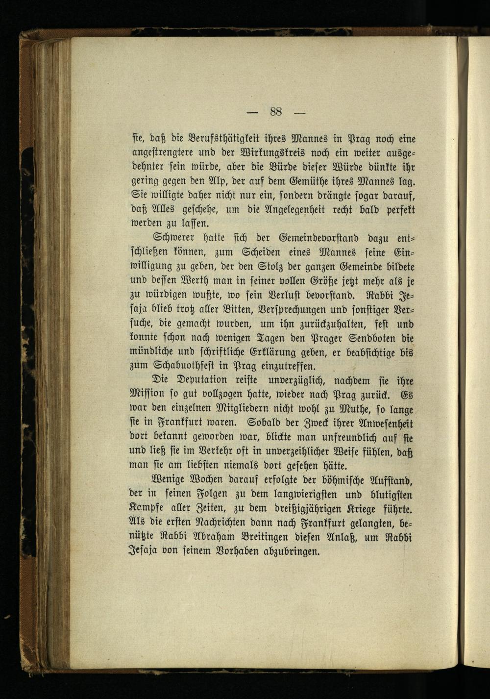Wenige Wochen darauf erfolgte der böhmische Ausstand, der in seinen Folgen zu dem langwierigsten und blutigsten Kampfe aller Zeiten, zu dem dreißigjährigen Kriege führte. Als die ersten Nachrichten dann nach Frankfurt gelangten, benützte Rabbi Abraham Breitingen diesen Anlaß, um Rabbi Jesaja von seinem Vorhaben abzubringen.