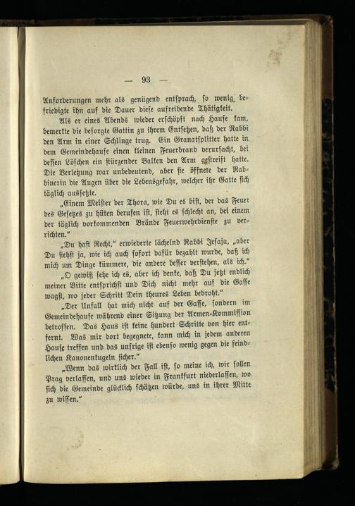 Als er eines Abends wieder erschöpft nach Hause kam, bemerkte die besorgte Gattin zu ihrem Entsetzen, daß der Rabbi den Arm in einer Schlinge trug. Ein Granatsplitter hatte in dem Gemeindehause einen kleinen Feuerbrand verursacht, bei dessen Löschen ein stürzender Balken den Arm gestreift hatte. Die Verletzung war unbedeutend, aber sie öffnete der Rabbinerin die Augen über die Lebensgefahr, welcher ihr Gatte sich täglich aussetzte.