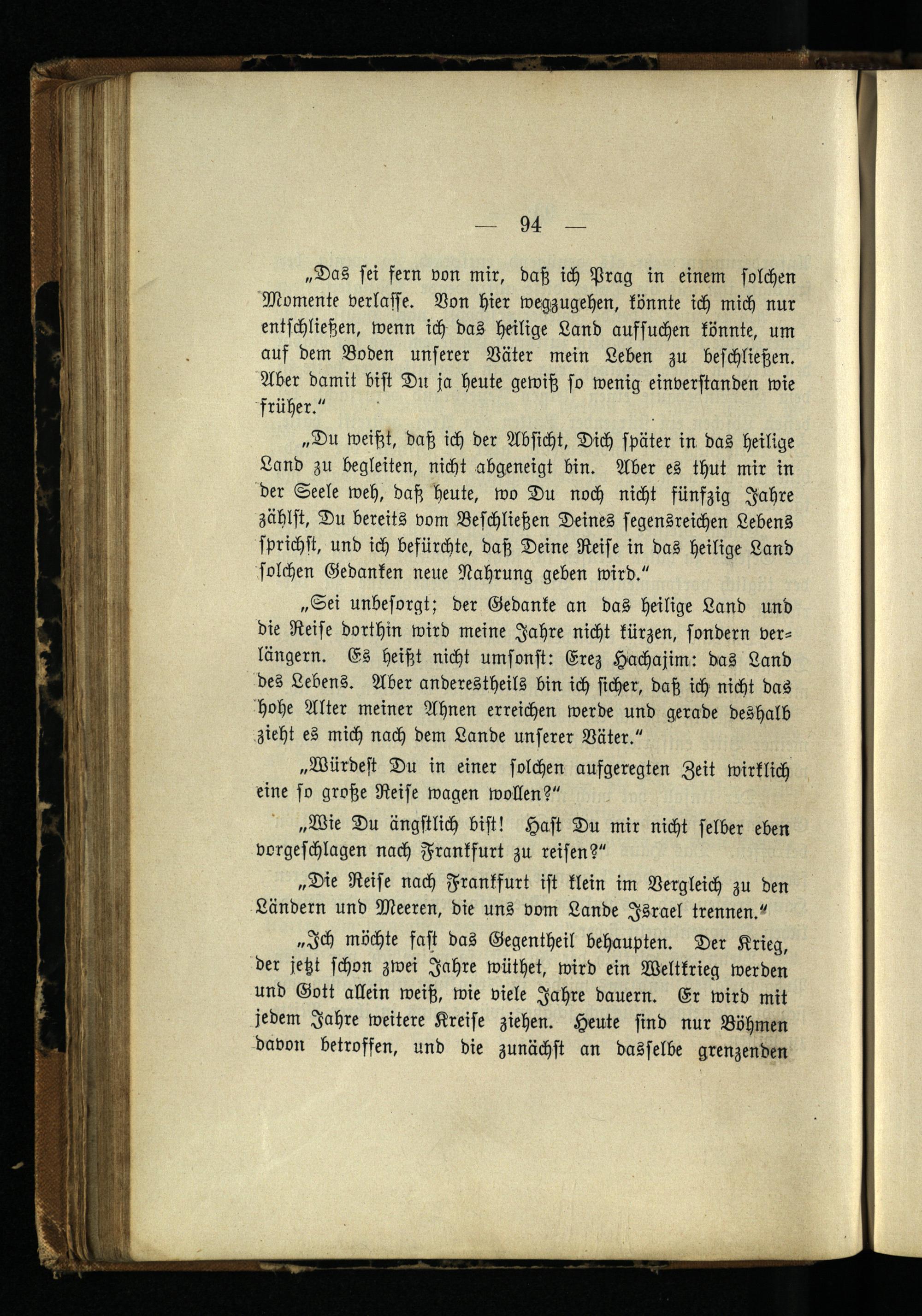 „Das sei fern von mir, daß ich Prag in einem solchen Momente verlasse. Von hier wegzugehen, könnte ich mich nur entschließen, wenn ich das heilige Land aufsuchen könnte, um aus dem Boden unserer Väter mein Leben zu beschließen. Aber damit bist Du ja heute gewiß so wenig einverstanden wie früher."