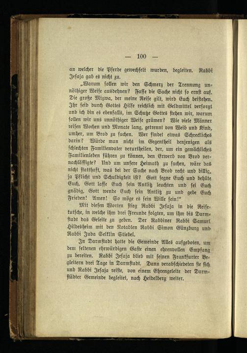 In Darmstadt hatte die Gemeinde Alles aufgeboten, um dem seltenen ehrwürdigen Gaste einen ehrenvollen Empfang zu bereiten. Rabbi Jesaja blieb mit seinen Frankfurter Begleitern drei Tage in Darmstadt . Dann verabschiedeten sie sich und Rabbi Jesaja reiste, von einem Ehrengeleite der Darm städter Gemeinde begleitet, nach Heidelberg weiter.