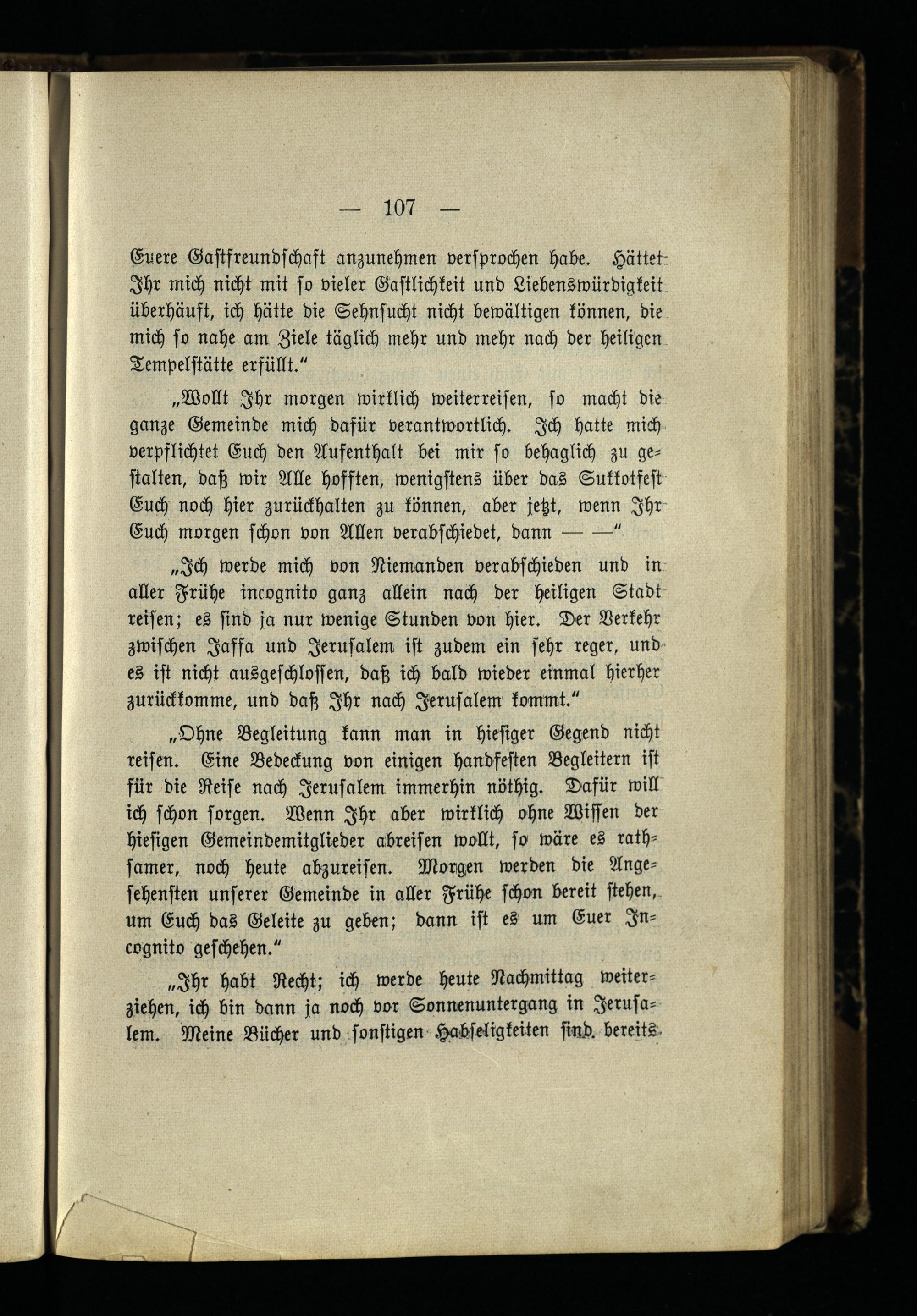 „Ohne Begleitung kann man in hiesiger Gegend nicht reisen. Eine Bedeckung von einigen handfesten Begleitern ist für die Reise nach Jerusalem immerhin nöthig. Dafür will ich schon sorgen. Wenn Ihr aber wirklich ohne Wissen der hiesigen Gemeindemitglieder abreisen wollt, so wäre es rath- samer, noch heute abzureisen. Morgen werden die Angesehensten unserer Gemeinde in aller Frühe schon bereit stehen, um Euch das Geleite zu geben; dann ist es um Euer Inkognito geschehen."