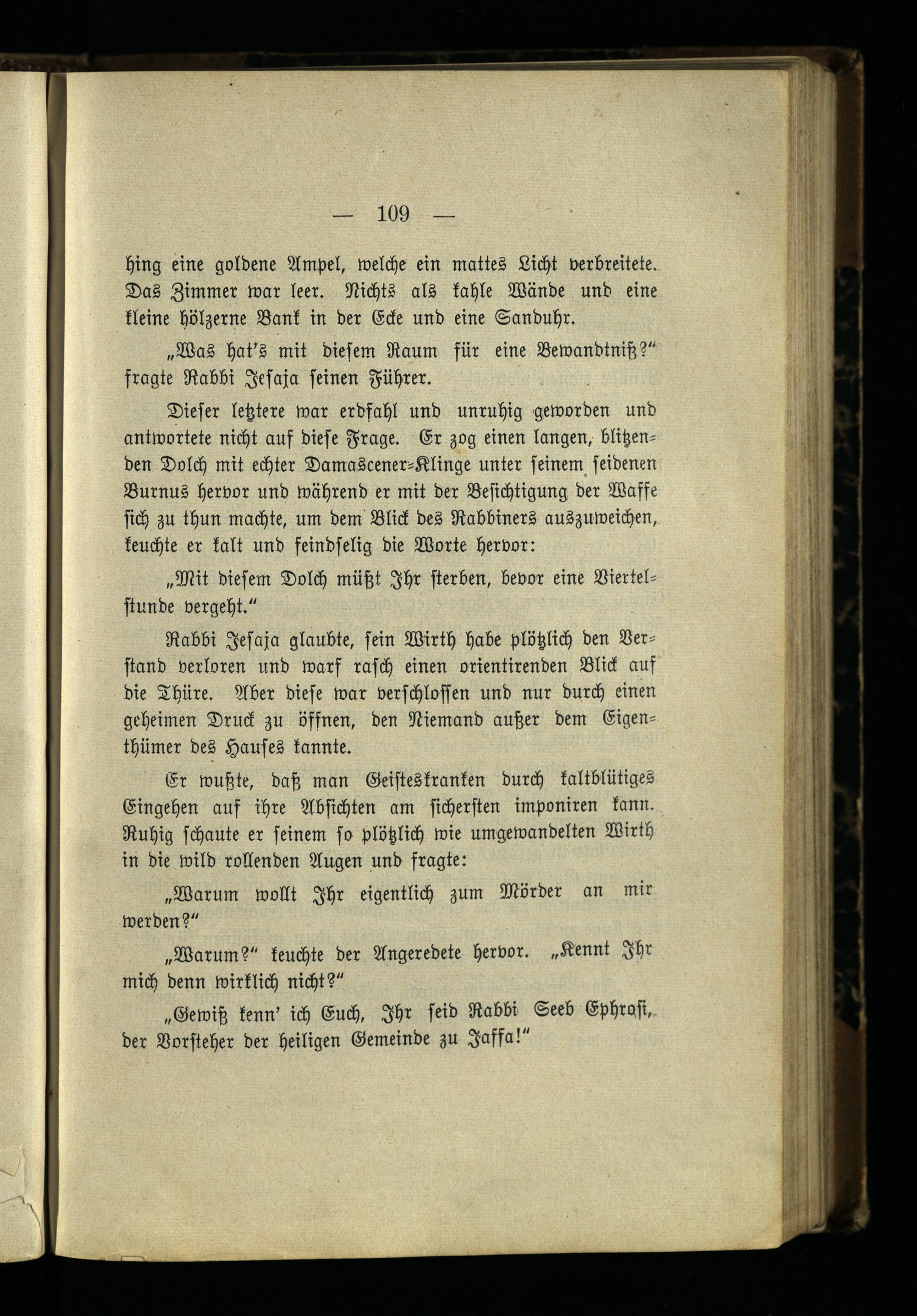 Dieser letztere war erdfahl und unruhig geworden und antwortete nicht auf diese Frage. Er zog einen langen, blitzenden Dolch mit echter Damascener-Klinge unter seinem seidenen Burnus hervor und während er mit der Besichtigung der Waffe sich zu thun machte, um dem Blick des Rabbiners auszuweichen, keuchte er kalt und feindselig die Worte hervor: