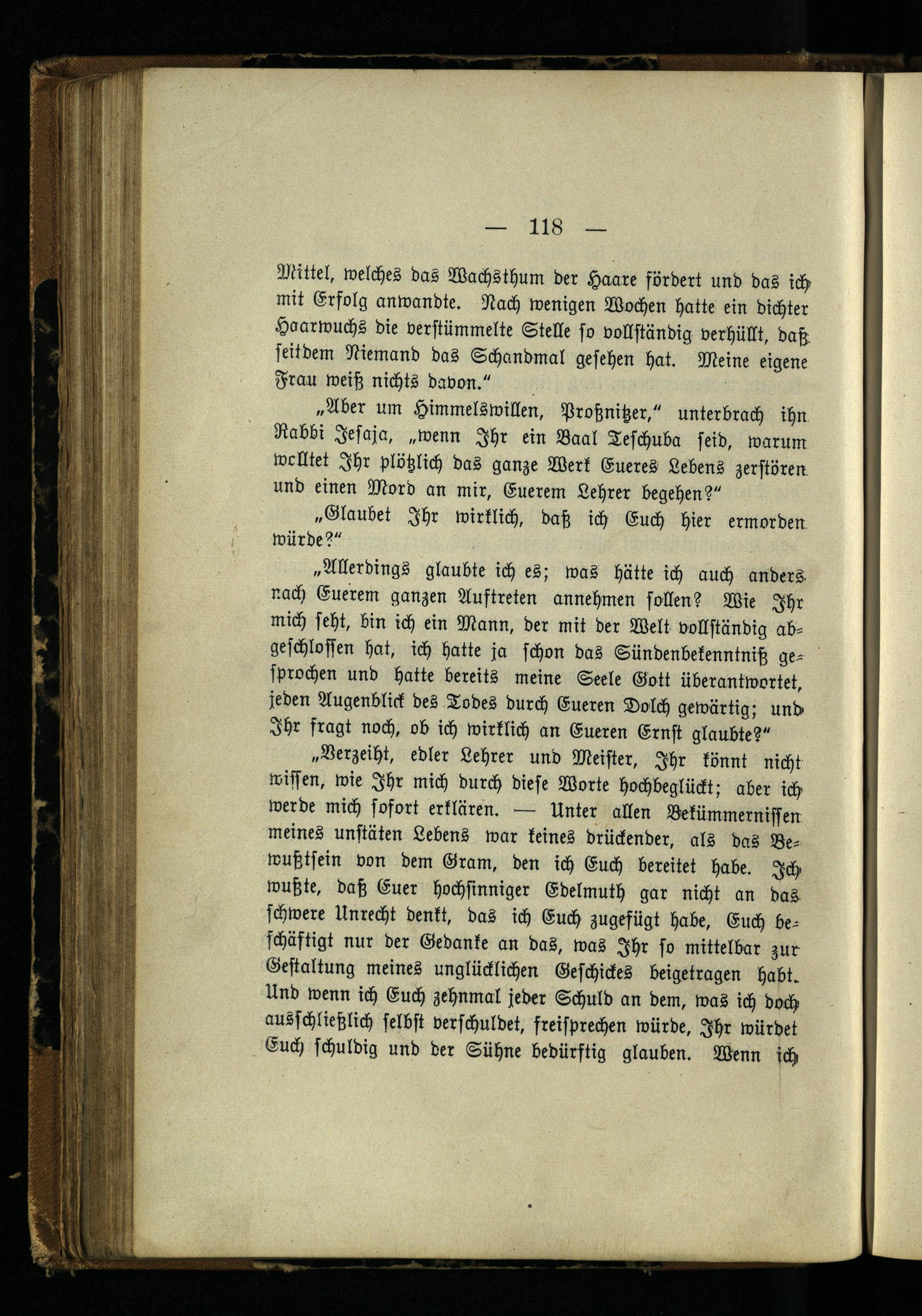 „Aber um Himmelswillen, Proßnitzer," unterbrach ihn Rabbi Jesaja, „wenn Ihr ein Baal Teschuba seid, warum wolltet Ihr plötzlich das ganze Werk Eueres Lebens zerstören und einen Mord an mir, Euerem Lehrer begehen?"