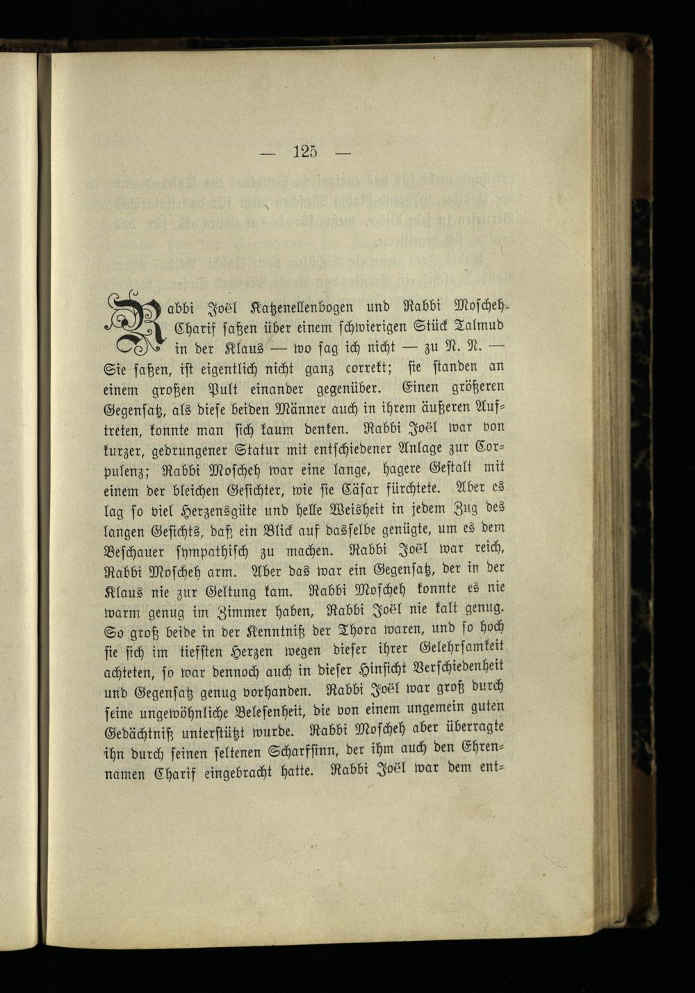 abbi Jo«l Katzenellenbogen und Rabbi Moscheh. Charis saßen über einem schwierigen Stück Talmud in der Klaus — wo sag ich nicht — zu N. N. — Sie saßen, ist eigentlich nicht ganz correkt; sie standen an einem großen Pult einander gegenüber. Einen größeren Gegensatz, als diese beiden Männer auch in ihrem äußeren Auftreten, konnte man sich kaum denken. Rabbi IM war von kurzer, gedrungener Statur mit entschiedener Anlage zur Korpulenz; Rabbi Moscheh war eine lange, hagere Gestalt mit einem der bleichen Gesichter, wie sie Cäsar fürchtete. Aber es lag so viel Herzensgüte und Helle Weisheit in jedem Zug des langen Gesichts, daß ein Blick auf dasselbe genügte, um es dem Beschauer sympathisch zu machen. Rabbi IM war reich, Rabbi Moscheh arm. Aber das war ein Gegensatz, der in der Klaus nie zur Geltung kam. Rabbi Moscheh konnte es nie warm genug im Zimmer haben, Rabbi IM nie kalt genug. So groß beide in der Kenntniß der Thora waren, und so hoch sie sich im tiefsten Herzen wegen dieser ihrer Gelehrsamkeit achteten, so war dennoch auch in dieser Hinsicht Verschiedenheit und Gegensatz genug vorhanden. Rabbi IM war groß durch seine ungewöhnliche Belesenheit, die von einem ungemein guten Gedächtniß unterstützt wurde. Rabbi Moscheh aber überragte ihn durch seinen seltenen Scharfsinn, der ihm auch den Ehrennamen Charis eingebracht hatte. Rabbi IM war dem ent-