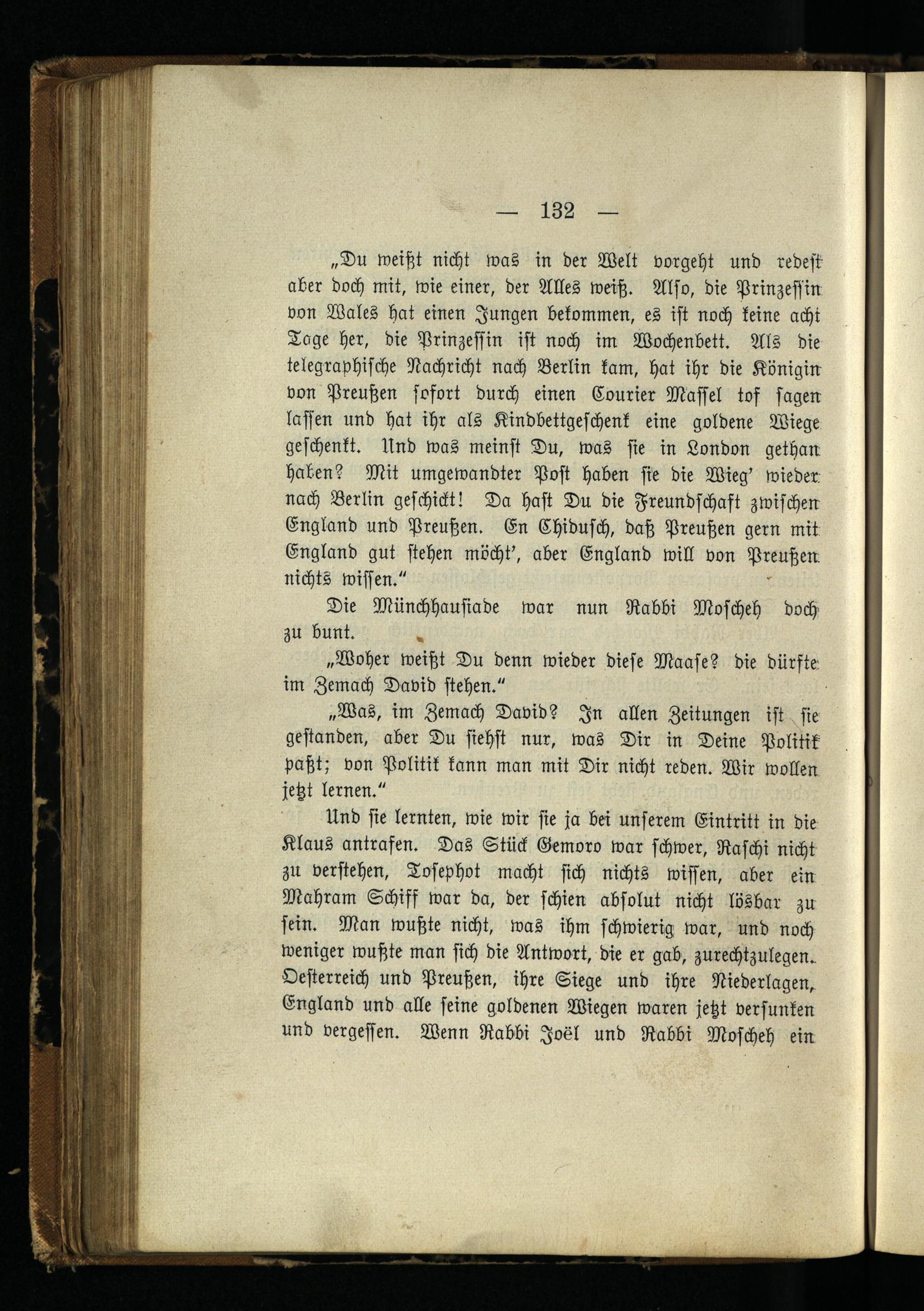 „Du weißt nicht was in der Welt vorgeht und redest aber doch mit, wie einer, der Alles weiß. Also, die Prinzessin von Wales hat einen Jungen bekommen, es ist noch keine acht Tage her, die Prinzessin ist noch im Wochenbett. Als die telegraphische Nachricht nach Berlin kam, hat ihr die Königin von Preußen sofort durch einen Courier Massel tos sagen lassen und hat ihr als Kindbettgeschenk eine goldene Wiege geschenkt. Und was meinst Du, was sie in London gethan haben? Mit umgewandter Post haben sie die Wieg ' wieder nach Berlin geschickt! Da hast Du die Freundschaft zwischen England und Preußen. En Chidusch, daß Preußen gern mit England gut stehen möcht', aber England will von Preußen nichts wissen."