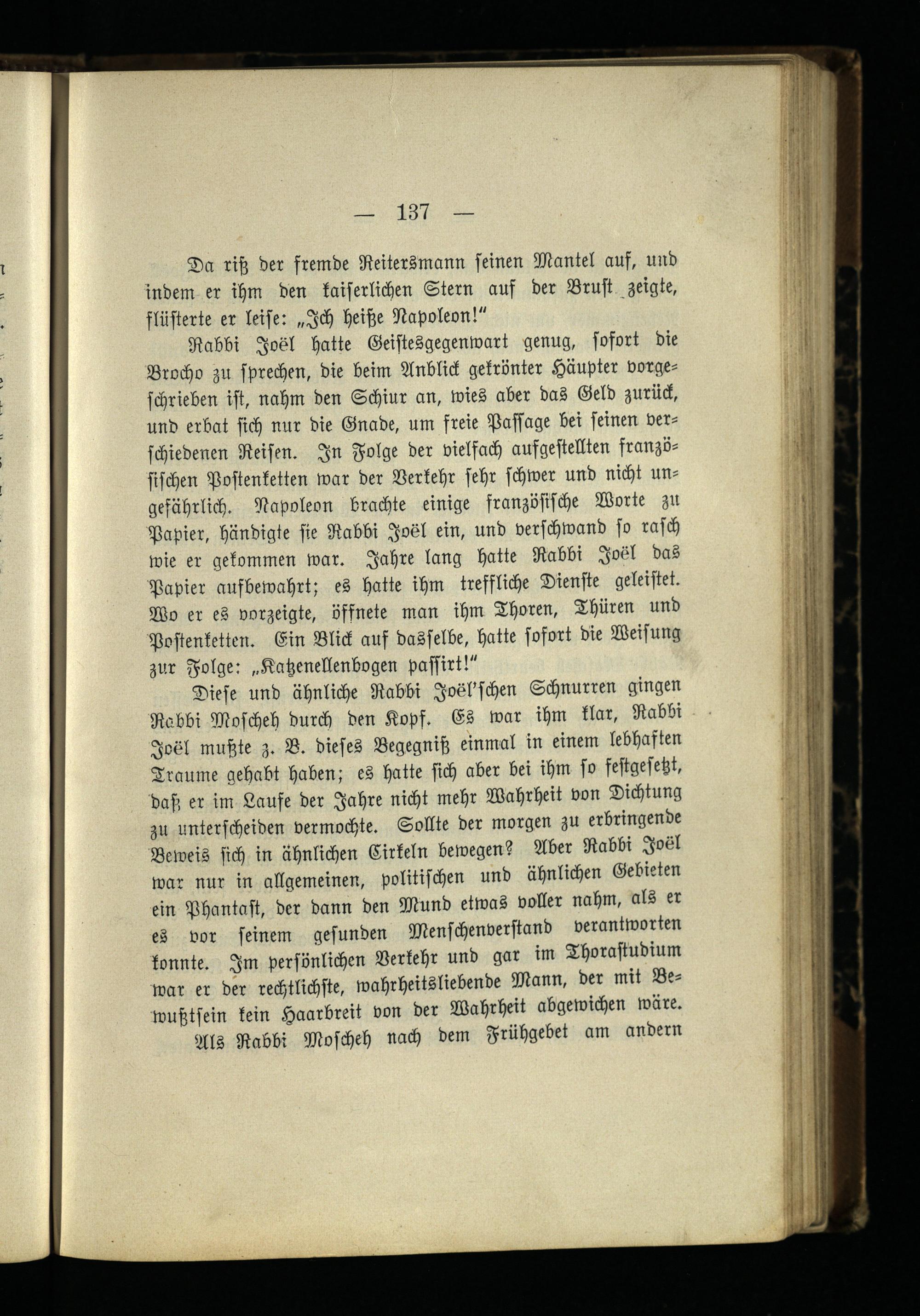 Rabbi Josl hatte Geistesgegenwart genug, sofort die Brocho zu sprechen, die beim Anblick gekrönter Häupter vorgeschrieben ist, nahm den Schnur an, wies aber das Geld zurück, und erbat sich nur die Gnade, um freie Passage bei seinen verschiedenen Reisen. In Folge der vielfach aufgestellten franzö sischen Postenketten war der Verkehr sehr schwer und nicht ungefährlich. Napoleon brachte einige französische Worte zu Papier, händigte sie Rabbi Jotzl ein, und verschwand so rasch wie er gekommen war. Jahre lang hatte Rabbi Josl das Papier aufbewahrt; es hatte ihm treffliche Dienste geleistet. Wo er es vorzeigte, öffnete man ihm Thoren, Thüren und Postenketten. Ein Blick auf dasselbe, hatte sofort die Weisung zur Folge: „Katzenellenbogen passirt!"
