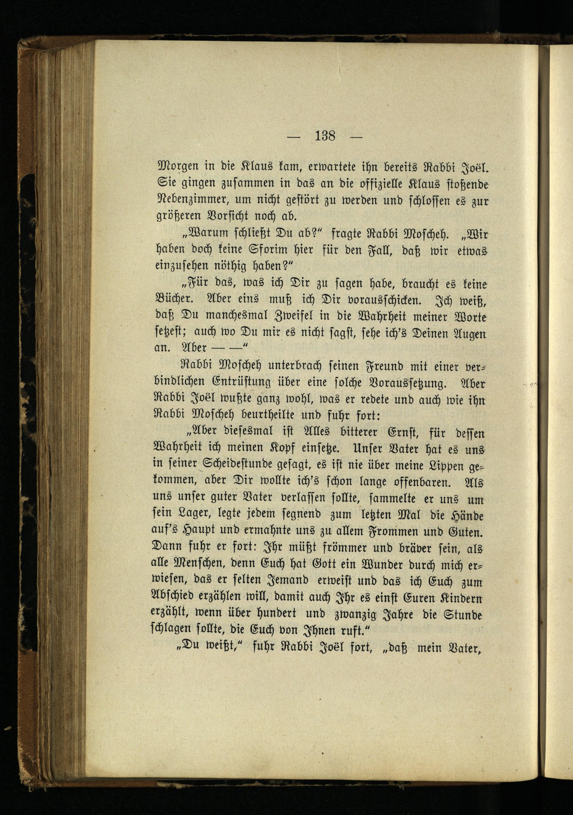 Rabbi Moscheh unterbrach seinen Freund mit einer verbindlichen Entrüstung über eine solche Voraussetzung. Aber Rabbi Joel wußte ganz wohl, was er redete und auch wie ihn Rabbi Moscheh beurtheilte und fuhr fort: