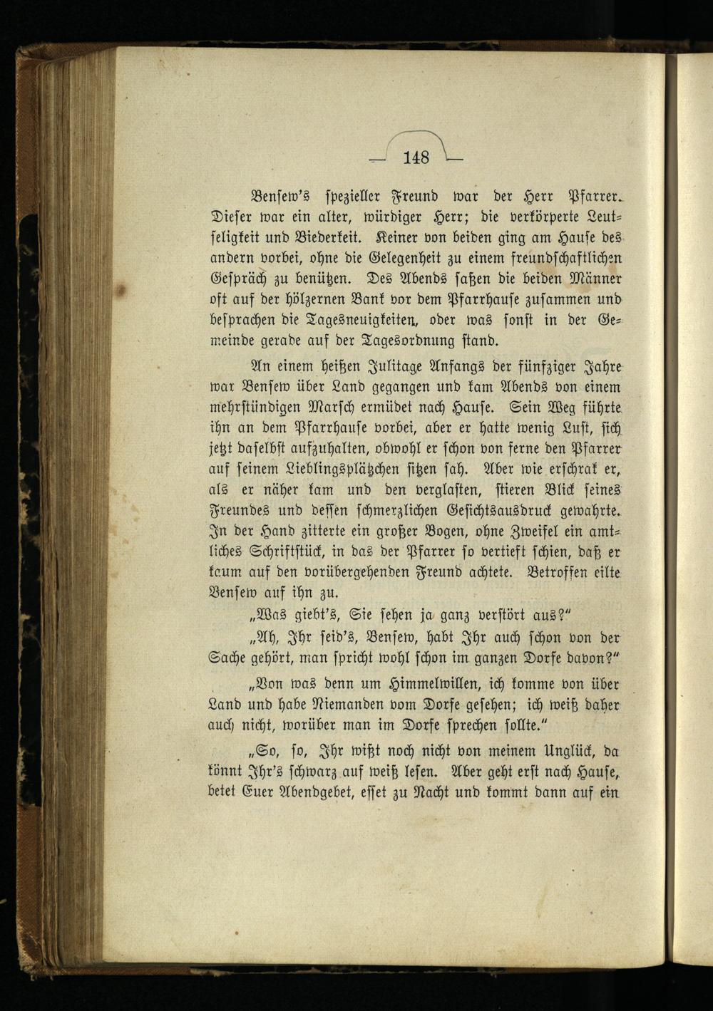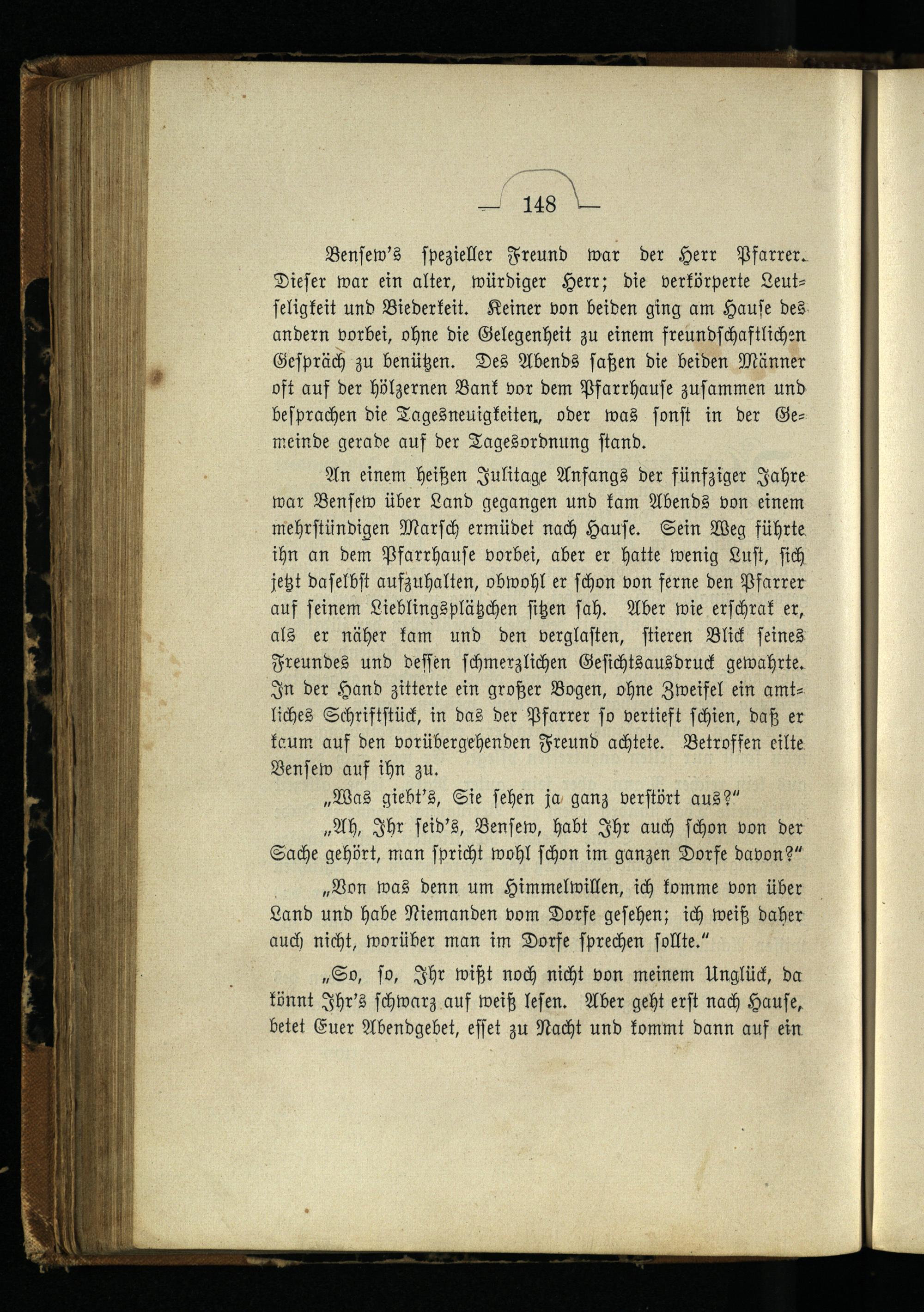 Bensew's spezieller Freund war der Herr Pfarrer. Dieser war ein alter, würdiger Herr; die verkörperte Leutseligkeit und Biederkeit. Keiner von beiden ging am Hause des andern vorbei, ohne die Gelegenheit zu einem freundschaftlichen Gespräch zu benützen. Des Abends saßen die beiden Männer oft auf der hölzernen Bank vor dem Pfarrhause zusammen und besprachen die Tagesneuigkeiten, oder was sonst in der Gemeinde gerade auf der Tagesordnung stand.
