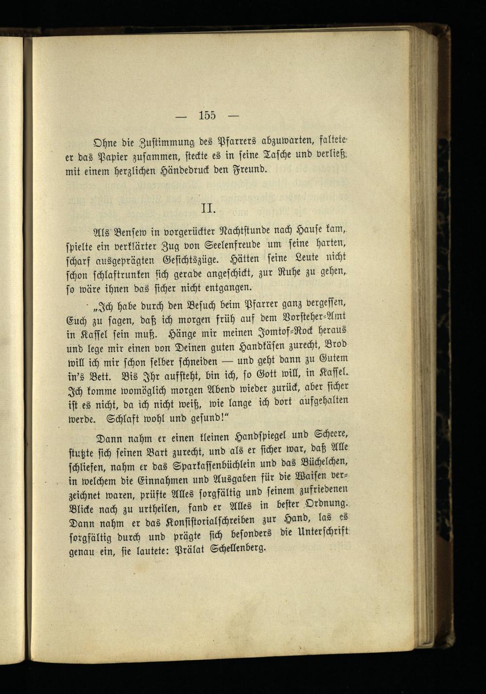 Dann nahm er einen kleinen Handspiegel und Schcere, stutzte sich seinen Bart zurecht, und als er sicher war, daß Alle schliefen, nahm er das Sparkassenbüchlein und das Büchelchen, in welchem die Einnahmen und Ausgaben für die Waisen verzeichnet waren, prüfte Alles sorgfältig und seinem zufriedenen Blicke nach zu urtheilen, fand er Alles in bester Ordnung. Dann nahm er das Konsistorialschreiben zur Hand, las es sorgfältig durch und prägte sich besonders die Unterschrift genau ein, sie lautete: Prälat Schellenberg.