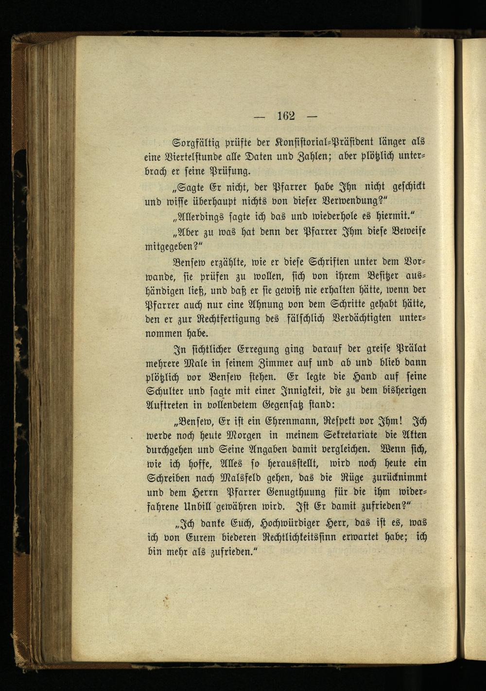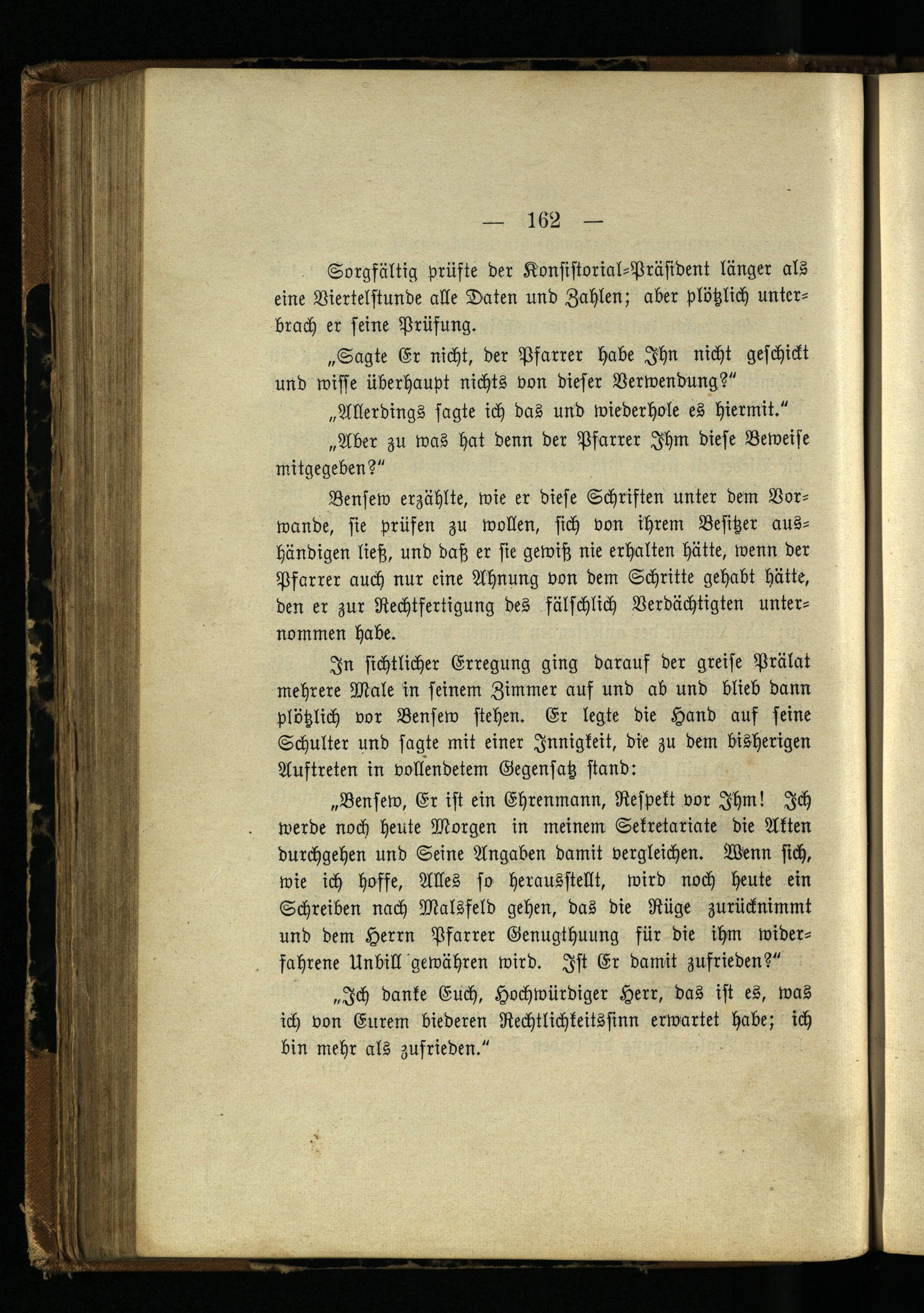„Bensew, Er ist ein Ehrenmann, Respekt vor Ihm! Ich werde noch heute Morgen in meinem Sekretariate die Akten durchgehen und Seine Angaben damit vergleichen. Wenn sich, wie ich hoffe, Alles so herausstellt, wird noch heute ein Schreiben nach Malsfeld gehen, das die Rüge zurücknimmt und dem Herrn Pfarrer Genugthuung für die ihm widerfahrene Unbill gewähren wird. Ist Er damit zufrieden?"