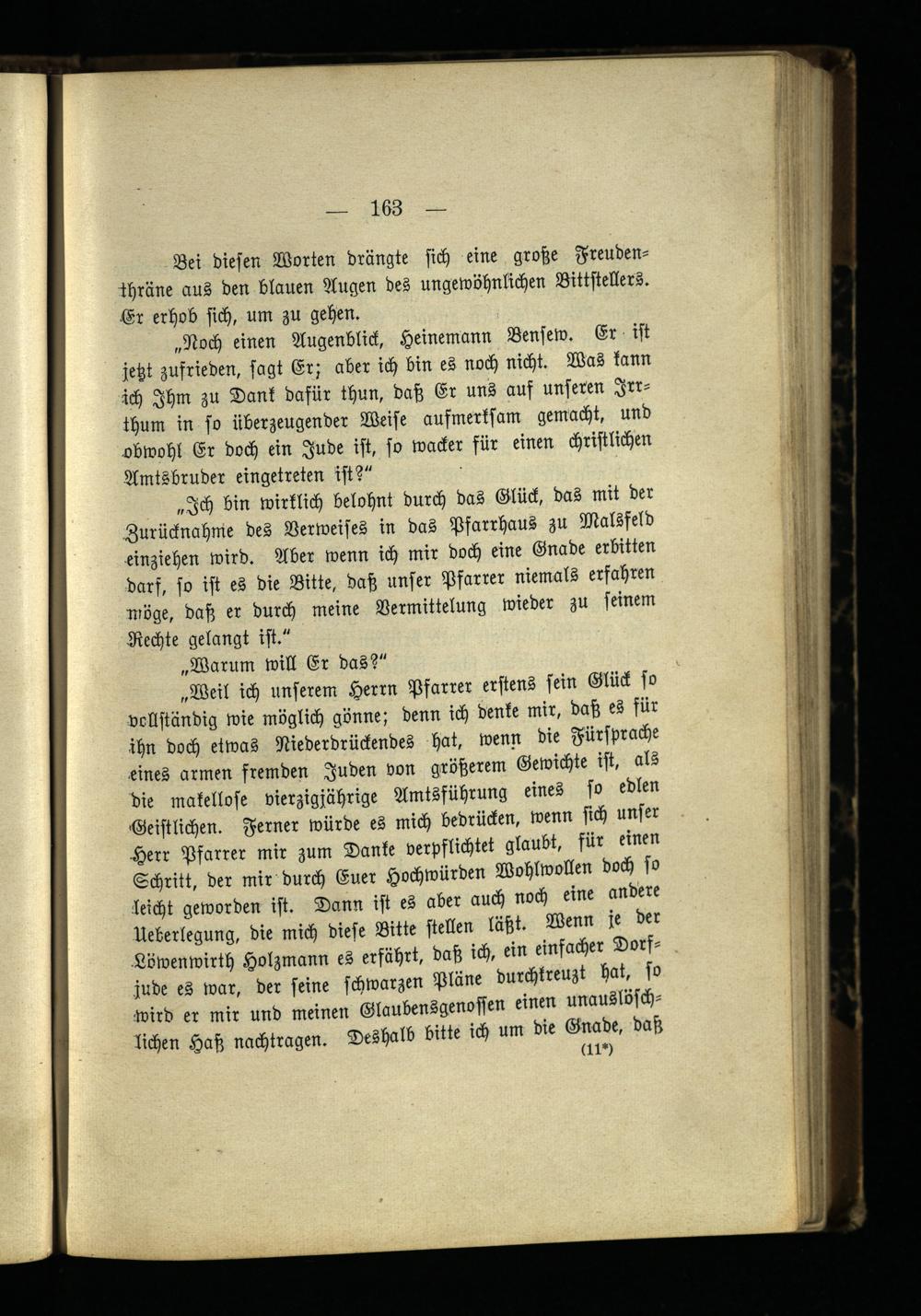 „Weil ich unserem Herrn Pfarrer erstens sein Glück so vollständig wie möglich gönne; denn ich denke mir, daß es für ihn doch etwas Niederdrückendes hat, wenn die Fürsprache eines armen fremden Juden von größerem Gewichte ist, als die makellose vierzigjährige Amtsführung eines so edlen 'Geistlichen. Ferner würde es mich bedrücken, wenn sich unser Herr Pfarrer mir zum Danke verpflichtet glaubt, für einen Schritt, der mir durch Euer Hochwürden Wohlwollen doch so leicht geworden ist. Dann ist es aber auch noch eine andere Ueberlegung, die mich diese Bitte stellen läßt. Wenn je der Löwenwirth Holzmann es erfährt, daß ich, ein einfacher Dorf- jude es war, der seine schwarzen Pläne durchkreuzt hat, so wird er mir und meinen Glaubensgenossen einen unauslöschlichen Haß Nachträgen. Deshalb bitte ich um die Gnade, daß